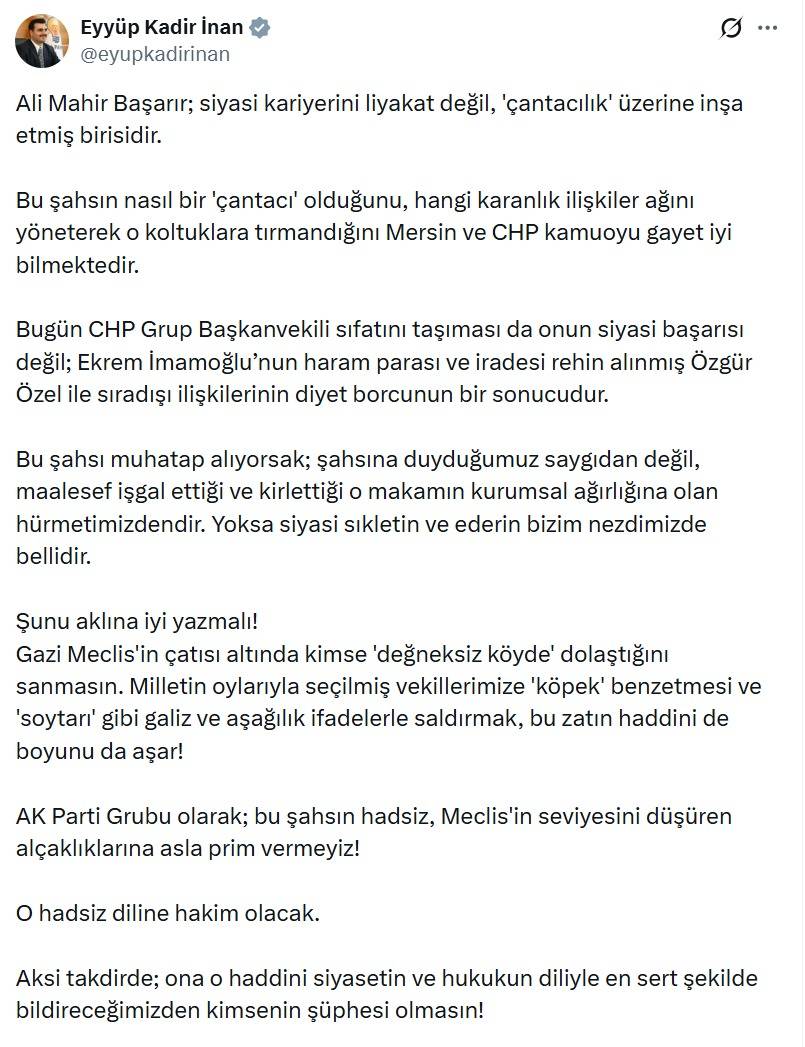 İnan, açıklamasında Ali Mahir Başarır’ın siyasi kariyerini liyakatle değil, “çantacılık” anlayışıyla inşa ettiğini savunarak, bu durumun Mersin’de ve CHP kamuoyunda bilindiğini ifade etti.