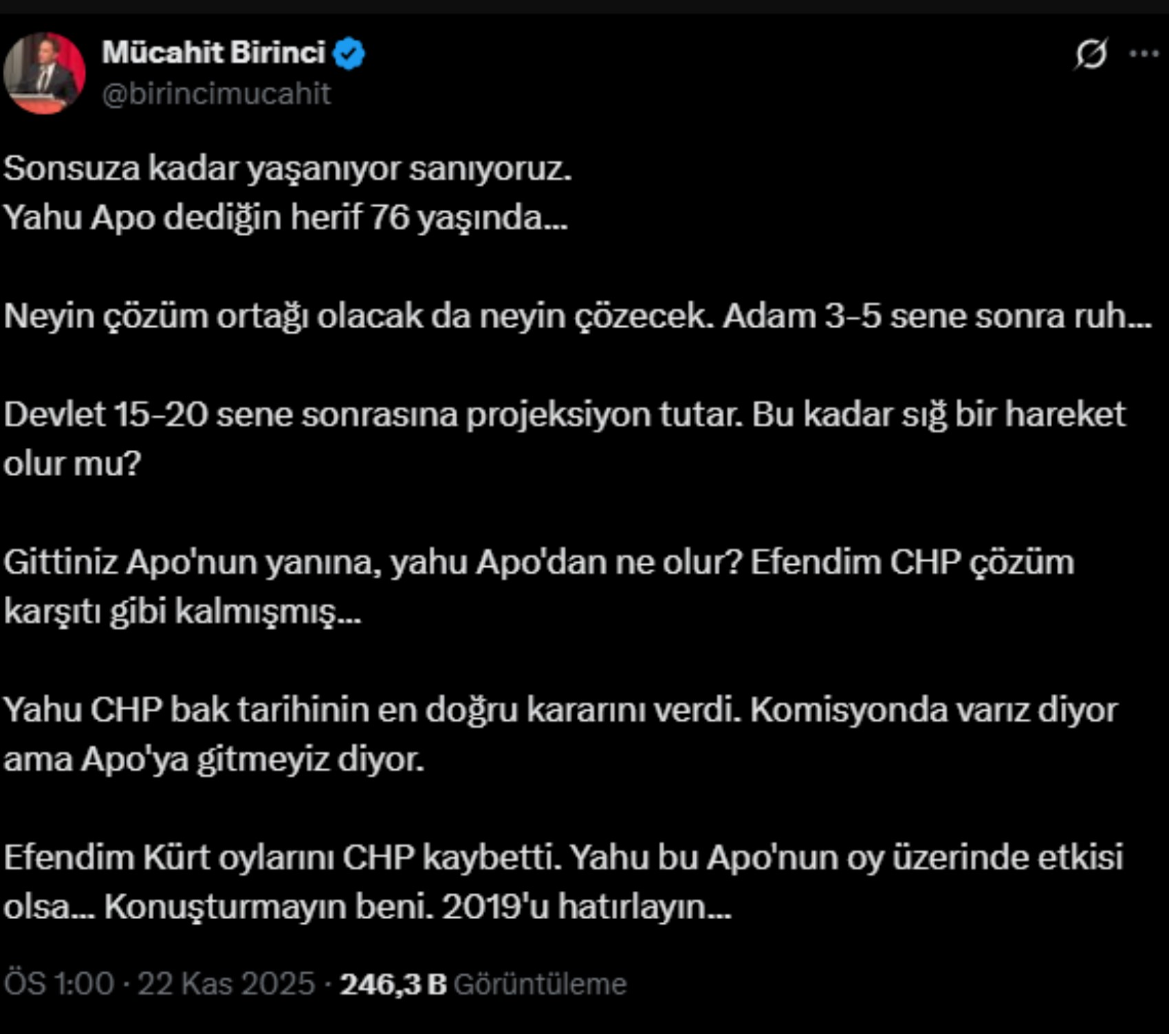 Komisyonda varız diyor ama Apo'ya gitmeyiz diyor. Efendim Kürt oylarını CHP kaybetti. Yahu bu Apo'nun oy üzerinde etkisi olsa... Konuşturmayın beni. 2019'u hatırlayın" dedi.