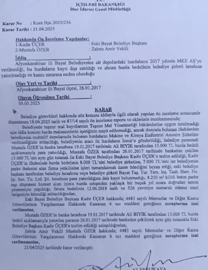 İçişleri Bakanlığı'nın ön inceleme raporunda, belediye taşınır mal kayıtlarının yönetmeliğe uygun tutulmadığı, hurdaların Makina Kimya Endüstrisi gibi kurumlara verilmediği ve satış sürecinde ciddi usulsüzlükler olduğu tespit edildi. Tüm bu deliller ışığında, 4483 sayılı Kanun gereğince Kadir Üçer hakkında soruşturma izni verilmesine karar verildiği açıklandı.