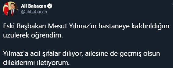 Demokrasi ve Atılım Partisi Genel Başkanı Ali Babacan sosyal medya hesabı üzerinden, Mesut Yılmaz'a destek mesajı yayınladı. Babacan, "Eski Başbakan Mesut Yılmaz’ın hastaneye kaldırıldığını üzülerek öğrendim. Yılmaz’a acil şifalar diliyor, ailesine de geçmiş olsun dileklerimi iletiyorum" dedi.