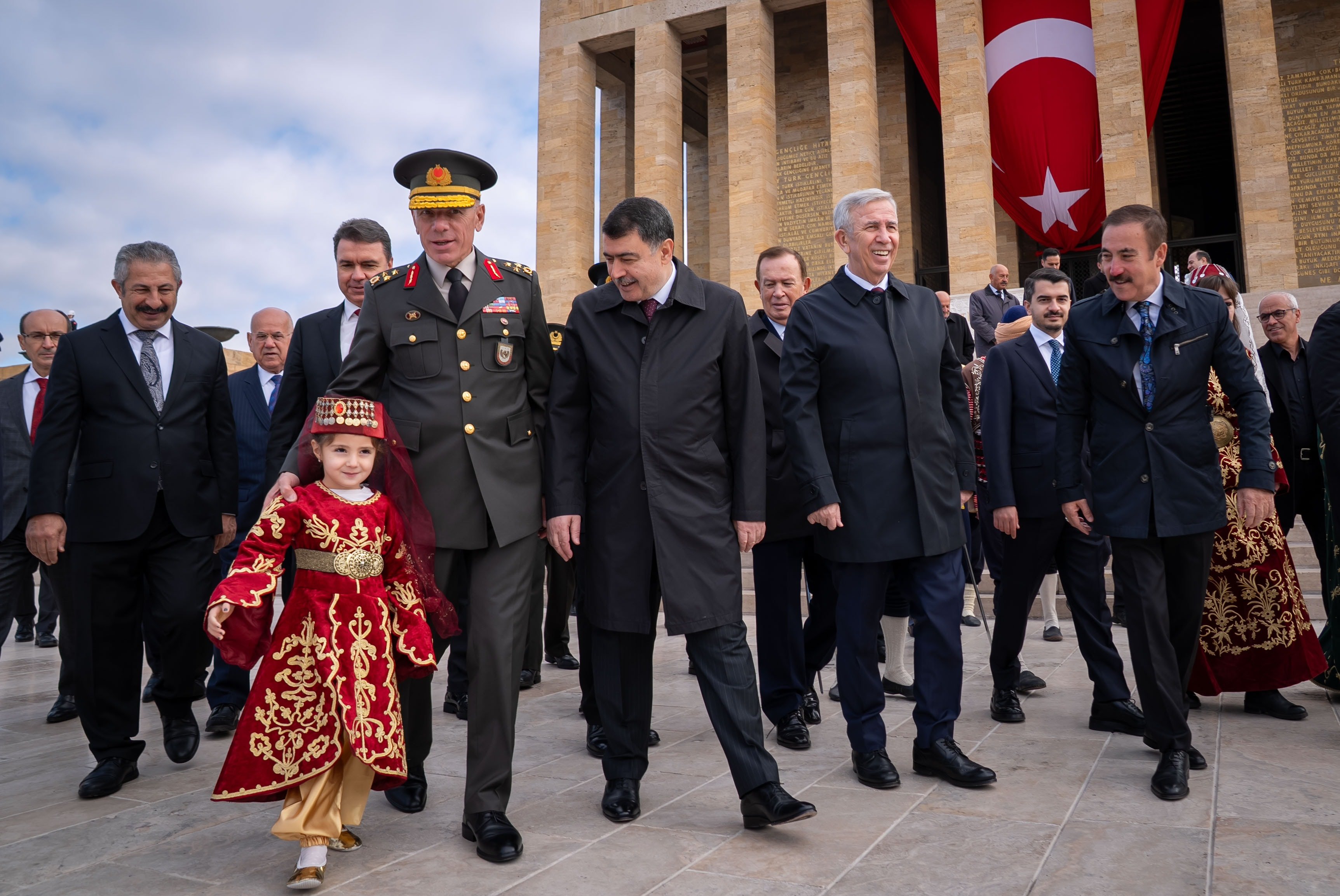 ABB Başkanı Mansur Yavaş, Ankara Valisi Vasip Şahin ve Ankara Cumhuriyet Başsavcısı Gökhan Karaköse ile birlikte Anıtkabir’de düzenlenen törene katıldı.