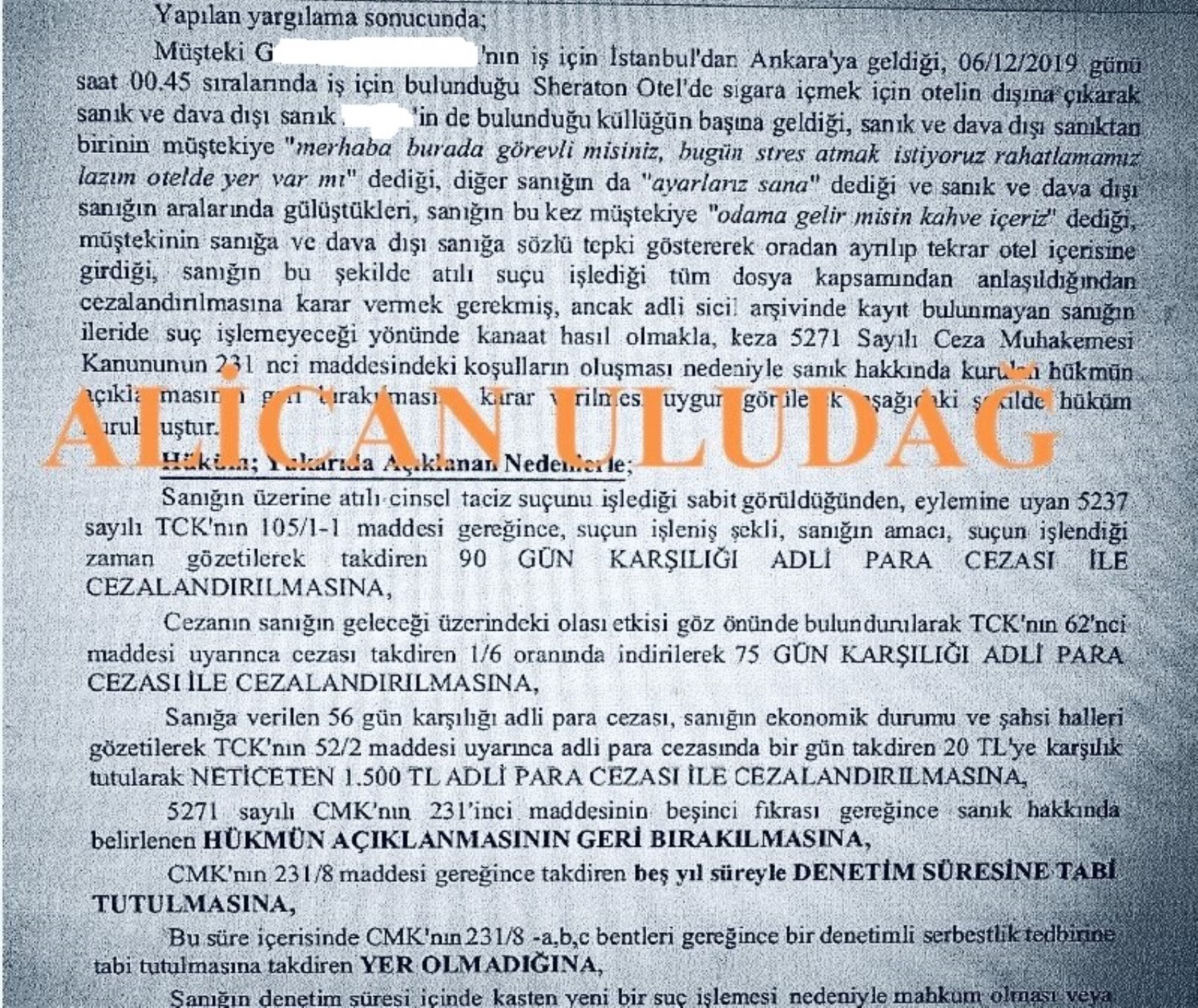 Alican Uludağ'ın özel haberine göre, mahkeme kararında, Aktaş’ın otel önünde sigara içen Azerbaycan uyruklu kadına “Bugün stres atmak istiyoruz, rahatlamamız lazım, otelde yer var mı”, “Odama gelir misin, kahve içeriz” sözlerini söylediği ifade edildi.