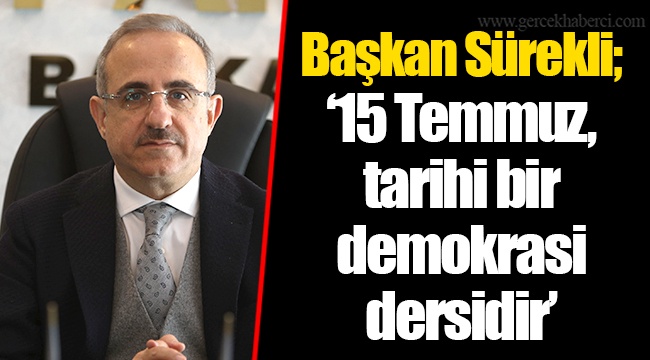 Milleti, milletin silahı ile vurmaya çalışan hainlere verilen bu tarihi cevabın büyük sorumlulukları beraberinde getirdiğini söyleyen Sürekli, “Bazen tarih kahramanları anlatmaz, kahramanlar tarih yazar. Türk Milleti’nin iradesi ile yazılan bu tarih; omuzlarımıza vatan, hürriyet ve bayrak aşkımızı diri tutarak milli birliğimizi muhafaza etme sorumluluğunu yüklemiştir. Cumhurbaşkanımız Recep Tayyip Erdoğan’ın dediği gibi; ‘Milletimizi yıldırmak bir yana azmini kamçılamışlardır. FETÖ içeriden, PKK dışarıdan, kimi alttan kimi üstten ne kadar uğraşırlarsa uğraşsınlar ezanımızı susturamayacak, bayrağımızı indiremeyecekler. Bu milletin söyleyecek çöz sözü, hayata geçireceği çok projesi var. Bu devletin daha harekete geçirecek çok potansiyeli var. Bu duygu ve düşüncelerle istiklâl ve istikbal mücadelemizin önderi, Cumhuriyetimizin kurucusu Gazi Mustafa Kemal Atatürk’ü ve tüm şehitlerimizi rahmetle yâd ediyorum. 15 Temmuz gecesi ‘Bugün değilse ne zaman öleceğiz?’ diyerek namlulara alnını dayayıp şehadete yürüyen şehitlerimize Allah’tan rahmet diliyor; gazilerimize şükranlarımı sunuyorum. Kimsenin şüphesi olmasın ki; tüm kahraman şehitlerimizin aileleri en mukaddes emanetimizdir. Vatan için canlarını hiçe sayanların cesaret ve şuurunu yitirmeyecek, düşmanı güldürmeyecek, ay yıldızlı şanlı bayrağı yere düşürmeyeceğiz.’’ dedi.
