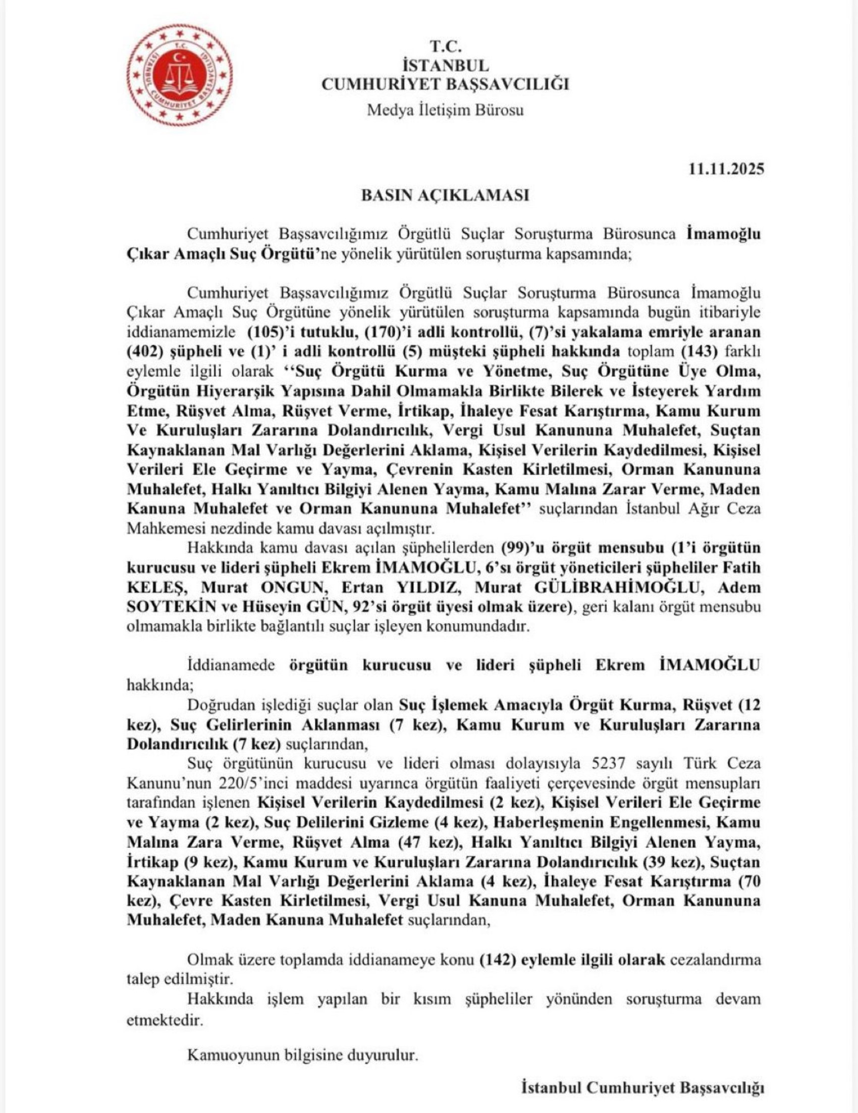 Cumhuriyet Başsavcılığımız Örgütlü Suçlar Soruşturma Bürosunca İmamoğlu Çıkar Amaçlı Suç Örgütüne yönelik yürütülen soruşturma kapsamında bugüne itibariyle tamamlanabilen (105)’i tutuklu, (170)’i adli kontrollü, (7)’si yakalama emriyle aranan, (402) şüpheli hakkında iddianame düzenlenmiş olup, müşteki şikayet dilekçelerine toplam (143) farklı eylemle ilgili olarak “Suç Örgütü Kurma ve Yönetme, Suç Örgütüne Üye Olma, Örgütün Hiyerarşik Yapısına Dahil Olmamakla Birlikte Bilerek ve İsteyerek Yardım Etme, Rüşvet Alma, Rüşvet Verme, İrtikap, İhaleye Fesat Karıştırma, Kamu Kurum ve Kuruluşları Zararına Dolandırıcılık, Vergi Usul Kanununa Muhalefet, Suçtan Kaynaklanan Mal Varlığı Değerlerini Aklama, Kişisel Verilerin Kaydedilmesi, Kişisel Verileri Ele Geçirme ve Yayma, Çevrenin Kasten Kirletilmesi, Orman Kanununa Muhalefet, Halkı Yanıltıcı Bilgiyi Alenen Yayma, Kamu Malına Zarar Verme, Maden Kanununa Muhalefet ve Orman Kanununa Muhalefet” suçlarından İstanbul Ağır Ceza Mahkemesi nezdinde kamu davası açılmıştır.