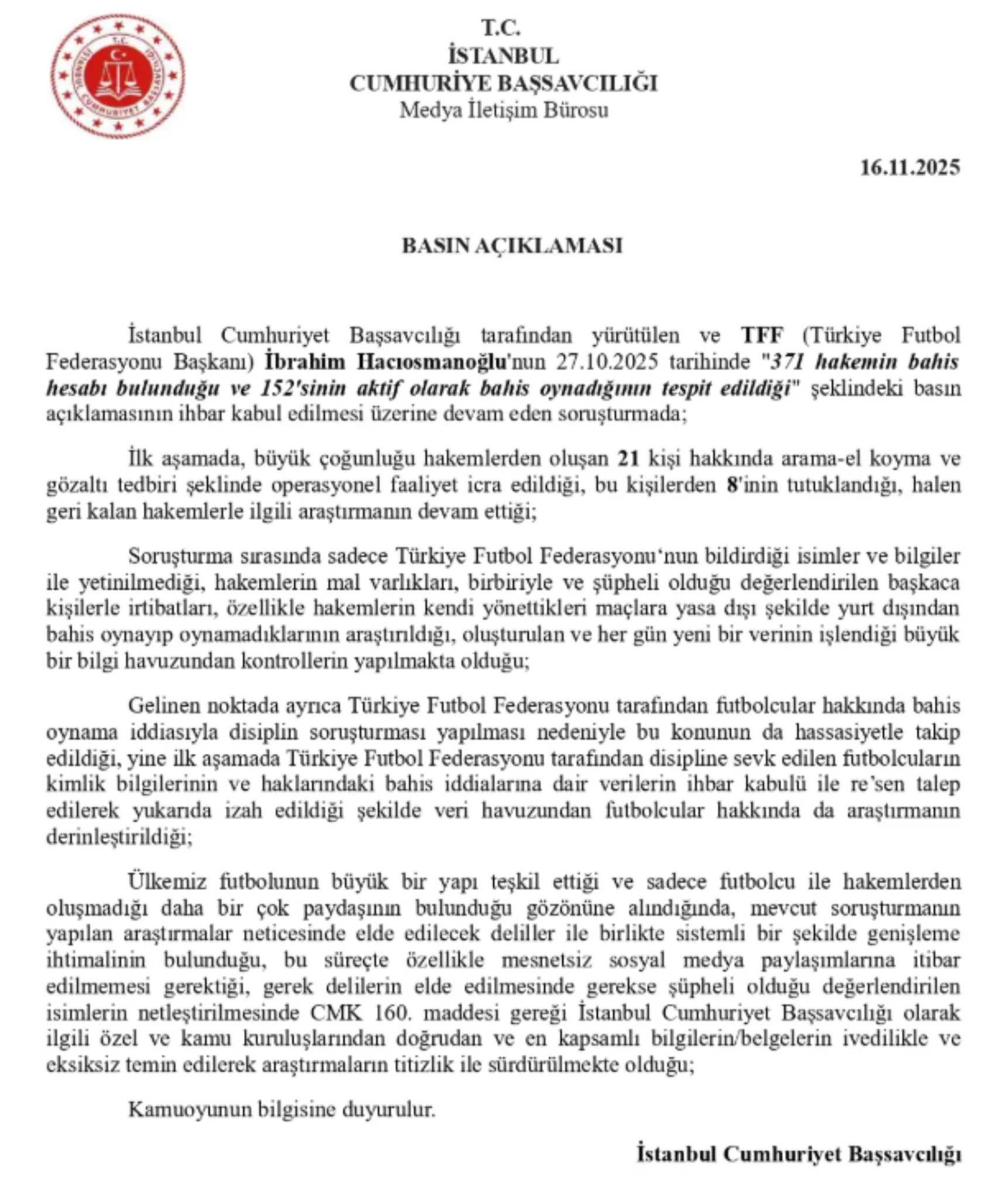 İstanbul Cumhuriyet Başsavcılığı, hakemlerle başlayan ve futbolcuların da dahil olduğu bahis soruşturmasının kapsamının genişleyebileceğini açıkladı.
