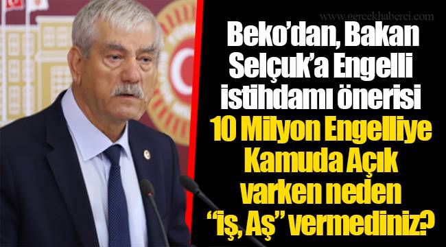 Engelli istihdam sorunuyla ilgili yapılan bütün çalışmalara ve uygulamalara rağmen, sorunun hâlen aşılamadığını kaydeden Beko, Aile, Çalışma ve Sosyal Hizmetler Bakanı’na seslenerek, “10 Milyon Engelliye Kamuda Açık varken neden “iş, Aş” vermediniz” diye sordu. Beko değerlendirmesinde; “Özellikle engellilerde istihdam sorunu, diğer insanlara nazaran daha fazladır. Engellilerin istihdam sorununun neden kaynaklandığına bakarsak, öncelikle kişinin engelli niteliğinden dolayı istihdam edilememesi, bir işveren engelli kişiyi işe alacağı zaman, öncelikle ‘özür oranı’ en az olanı veya iş konusunda nitelik olarak en verim alabileceği kişiyi seçiyor. Bu durumda, engeli fazla olan kişilerin iş bulma olanağını ne yazık ki azaltıyor. Eğitim ve beceri olarak en iyi olan engelliler tercih nedeni olurken, ilkokul mezunu bir kişiyle, üniversite mezunu olan bir kişi istihdam konusunda eşit fırsatlara sahip olamıyor. Eğitim ve öğrenim olanaklarına eşit biçimde erişemeyen kişiler arasında haksızlık yaratan bu sorunu bir an önce çözünüz” dedi.