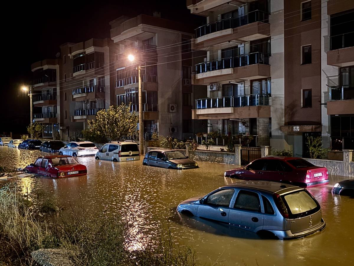 İzmir'in Bergama ilçesinde etkili olan kuvvetli sağanak nedeniyle sokaklar göle döndü, bazı ev, otel ve iş yerlerini su bastı, araçlar suda mahsur kaldı.