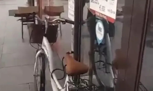 Dışarıda bulunan vatandaşların da yardımıyla içeride mahsur kalanları bisikleti kapıyla beraber içeriye sokarak dışarı çıkarttı.