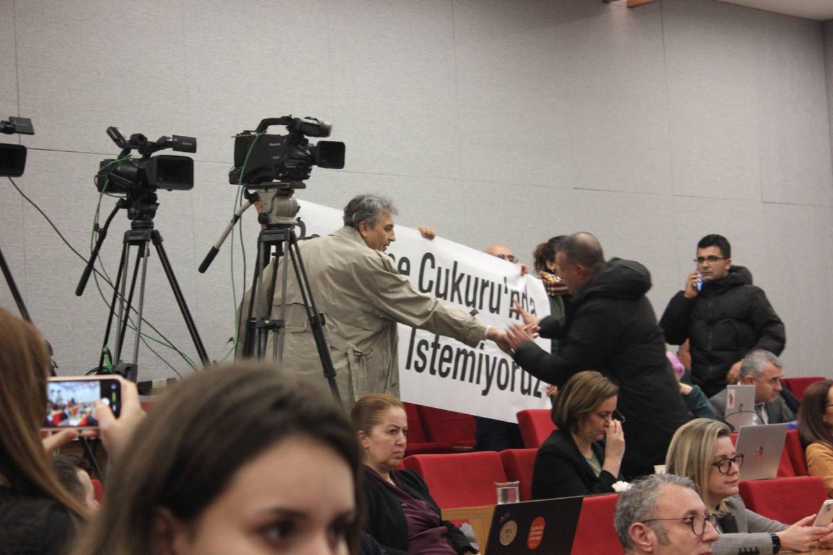 GÜLPERİ TİBİN-GERÇEK HABERCİ-İzmir Büyükşehir Belediye Meclisi Şubat Ayı Olağan toplantısı birinci oturumu gerçekleştirildi. Toplantıya İzmir Büyükşehir Belediye Başkanvekili Zafer Levent Yıldır başkanlık etti. Toplantının başlangıcında, mecliste Basmane Çukuru’yla ilgili protesto gerçekleştirildi. İzmir Büyükşehir Belediyesi ile TMSF arasında imzalanan ve kentte çeşitli tartışmalara neden olan niyet protokolünü protesto eden grup, pankart açarak slogan attı. Büyükşehir’e ait hissesinde kültür merkezi açılması planlanan alanda “gökdelen dikilmemesi” gerektiğini ifade eden grup, güvenlik güçleri tarafından engellendi. Eylemciler dışarı çıkarılırken meclise 10 dakika ara verildi.