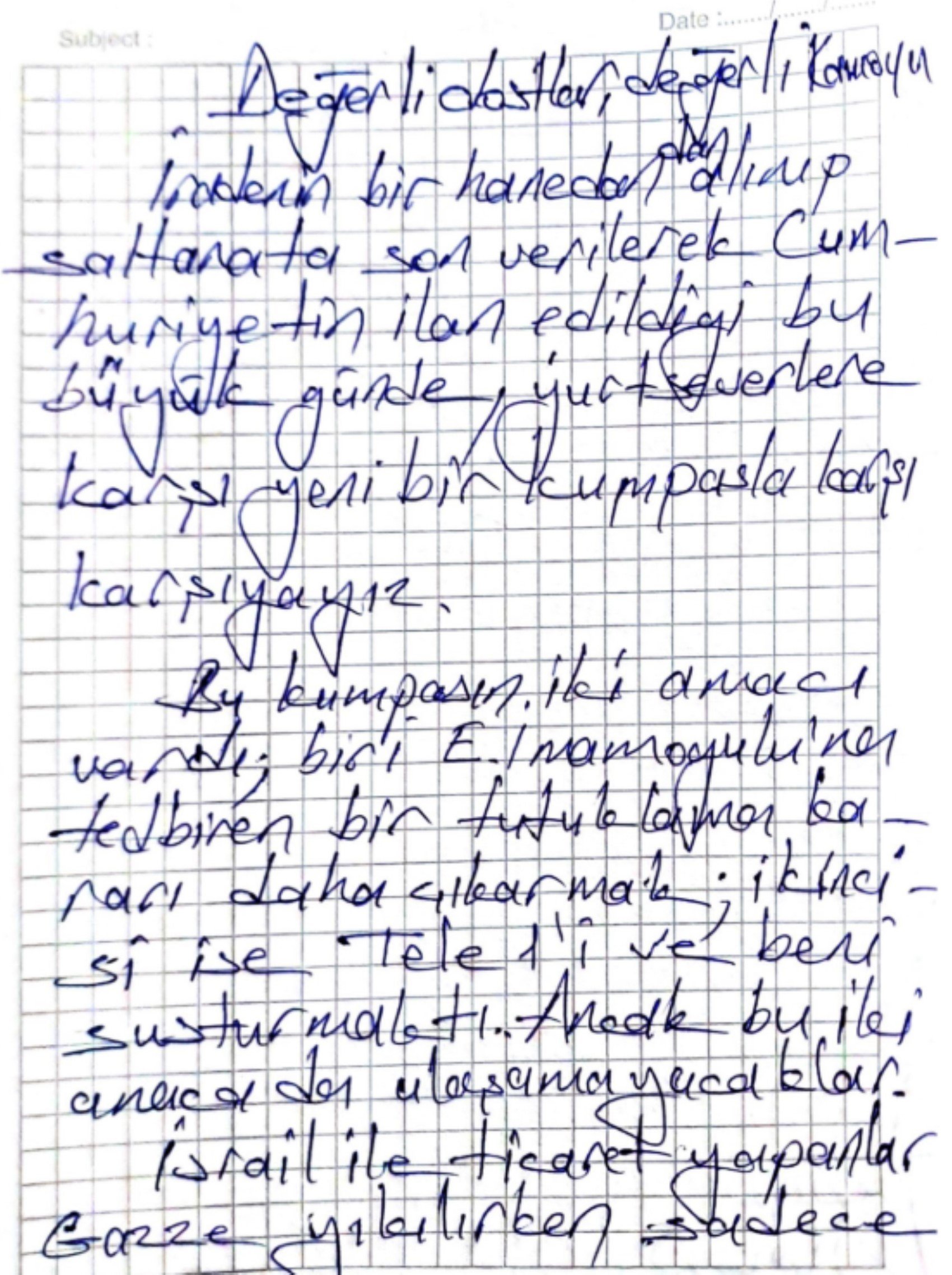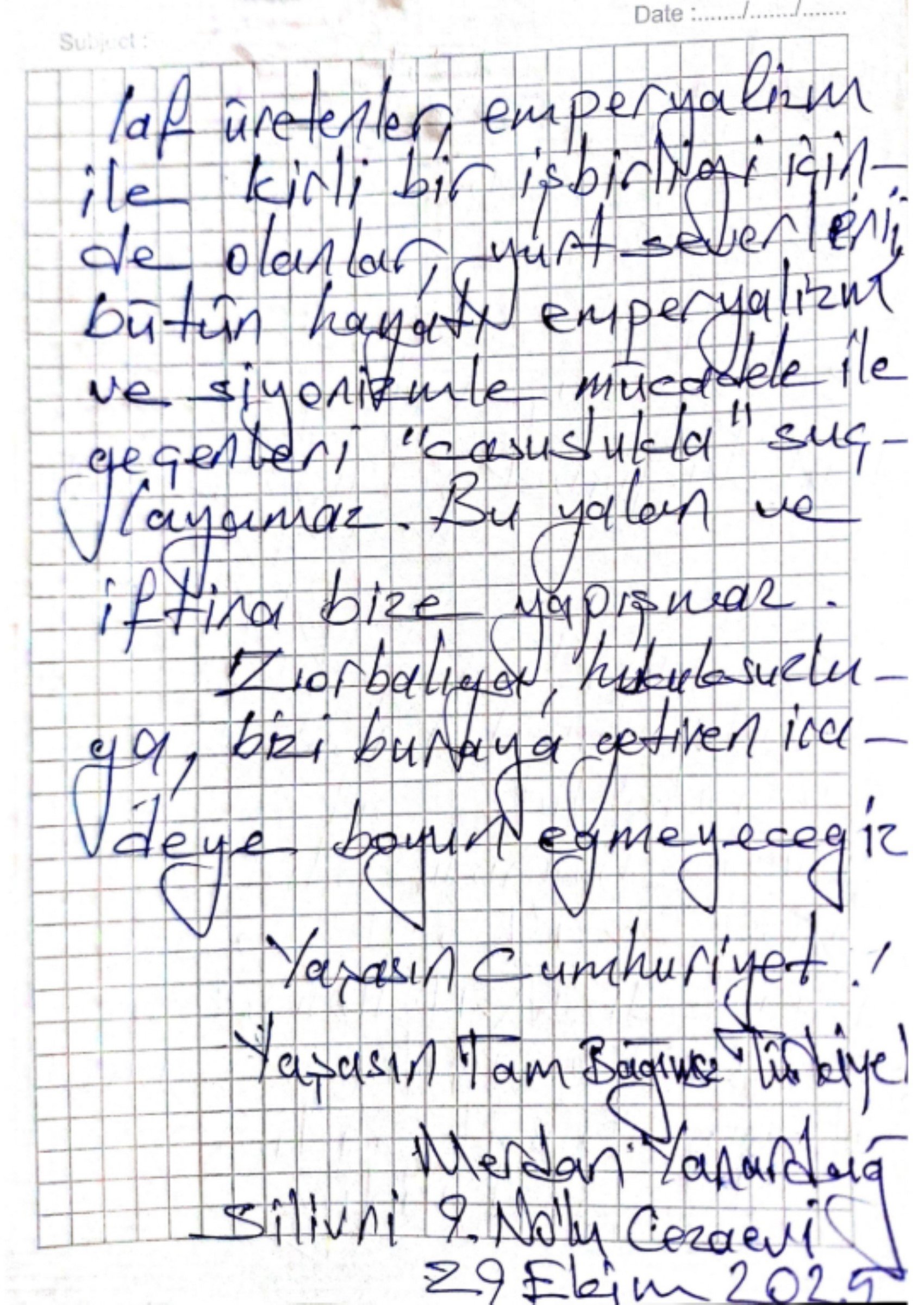 Merdan Yanardağ’ın tutuklanmasının ardından, gazeteci ve 12punto yazarı Müyesser Yıldız’a gönderdiği mesajda, 29 Ekim Cumhuriyet Bayramı’na atıfta bulunarak, "İradenin bir hanedandan alınıp saltanata son verilerek Cumhuriyetin ilan edildiği bu büyük günde yurtseverlere karşı yeni bir kumpasla karşı karşıyayız." ifadelerini kullandı.