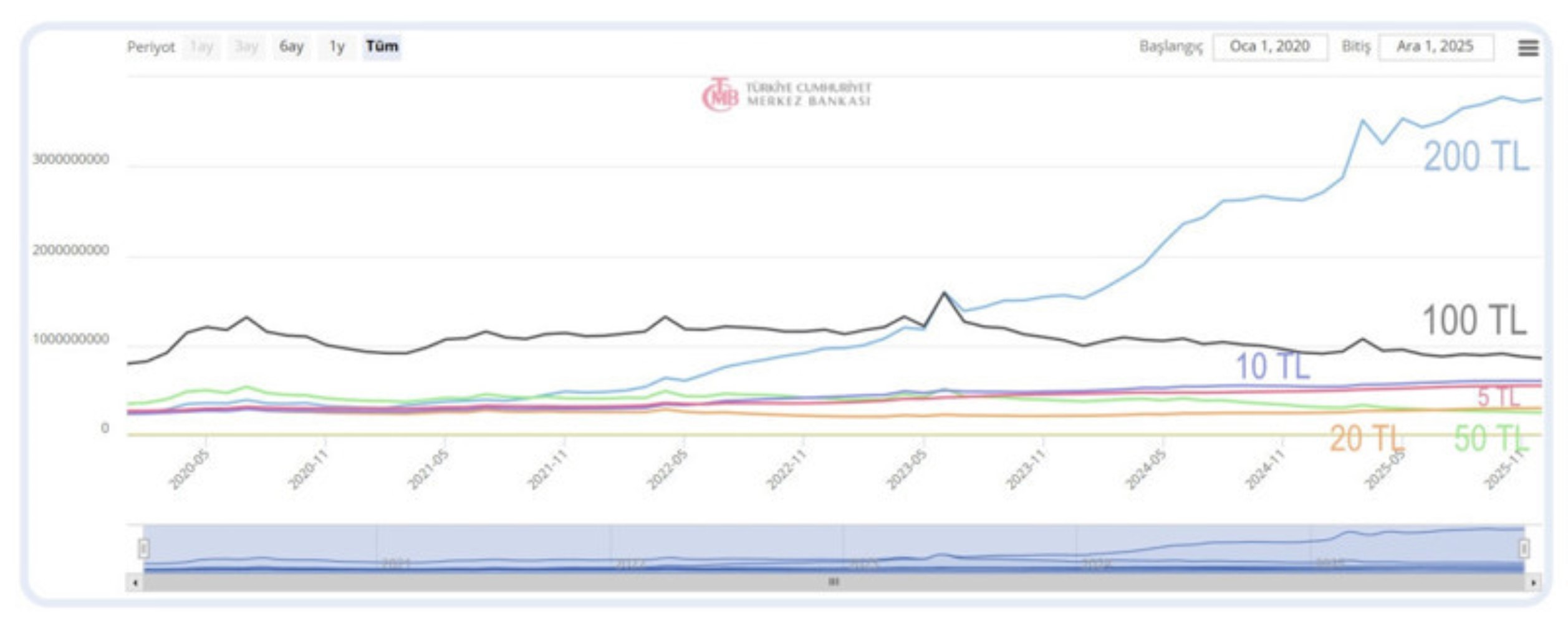 200 TL’lik banknotlar, 2023 Mayıs ayı ile 2025 Aralık arasındaki 2,5 yılda yüzde 218 oranında artış kaydederek, toplamda 3 milyar 757 milyon adedi aştı. Bu artışla birlikte 200 TL’likler piyasada egemen hale gelirken, daha düşük değerli banknotların kullanımı azaldı.