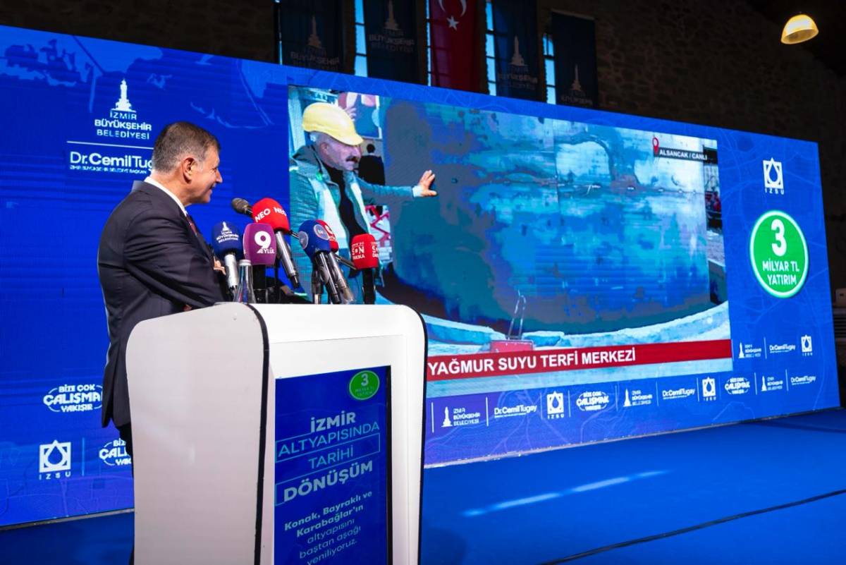 İZSU Genel Müdürü Gürkan Erdoğan ise projeye ilişkin bilgiler verdi. Erdoğan, konuşmasında şu ifadeleri kullandı: “2000’li yıllarda hayata geçirilen Büyük Kanal Projesi, yağmur suyu ayrıştırması yapılmadan uygulanmıştı. Bunun temel nedeni, ayrıştırmanın yüksek maliyet gerektirmesiydi. Bu durum, kent merkezinde özellikle yoğun yağışlarda taşkınlara yol açtı. Bugün hayata geçirdiğimiz projelerle bu eksiklik gideriliyor. Liman Caddesi ve Şehitler Bulvarı başta olmak üzere Alsancak, Konak, Bayraklı ve Karabağlar’da yağmur sularının kanalizasyon sistemine karışmadan Meles ve Arap derelerine, oradan da denize ulaşması sağlanıyor. Gökdelenler bölgesi, Çınarlı Hastanesi çevresi ve Halkapınar Metro İstasyonu civarında yaşanan göllenmelere karşı yeni hatlar ve terfi merkezleri devreye alınıyor. Alsancak Kordon’da ise yağmur suyu ve kanalizasyon hatları ayrıştırılıyor. İZSU’nun öz kaynaklarıyla yürütülen bu projede, deniz kabarması yaşansa dahi yağmur sularının güvenli şekilde deşarj edilmesi hedefleniyor. Böylece ana kolektör üzerindeki yük önemli ölçüde azaltılıyor. Mustafa Kemal Sahil Bulvarı hattında, Kadifekale’den başlayarak Konak ve Karabağlar’a uzanan bölgede yağmur suyu geciktirme depoları inşa ediliyor. Mithatpaşa ve Tarihi Asansör çevresinde hatlar yenilenerek yağmur sularının doğrudan denize ulaşması sağlanıyor. Temeli atılan dört proje saniyede toplam 20 metreküp yağmur suyunu karşılayacak kapasiteye sahip. Bu rakam, Çiğli Atık Su Arıtma Tesisi’ne gelen atık sudan daha yüksek bir yük anlamına geliyor ve taşkın riskini büyük ölçüde azaltıyor. Balatçık’ta çalışmalar sürerken, Bornova ve Buca 2. Etap projeleri Dünya Bankası kredisi kapsamında hayata geçiriliyor. Mavişehir ve Çınarlı’da yaşanan altyapı sorunları için de projeler hazırlandı. Bu çalışmalarla 44 kilometrelik yağmur suyu hattı tamamlandı, 103 kilometrelik hat yapım aşamasında. Toplamda 146 kilometrelik yeni yağmur suyu altyapısı oluşturuluyor. Bu, İzmir’de bugüne kadar yapılan toplam imalatın yaklaşık yüzde 25’ine denk geliyor.”