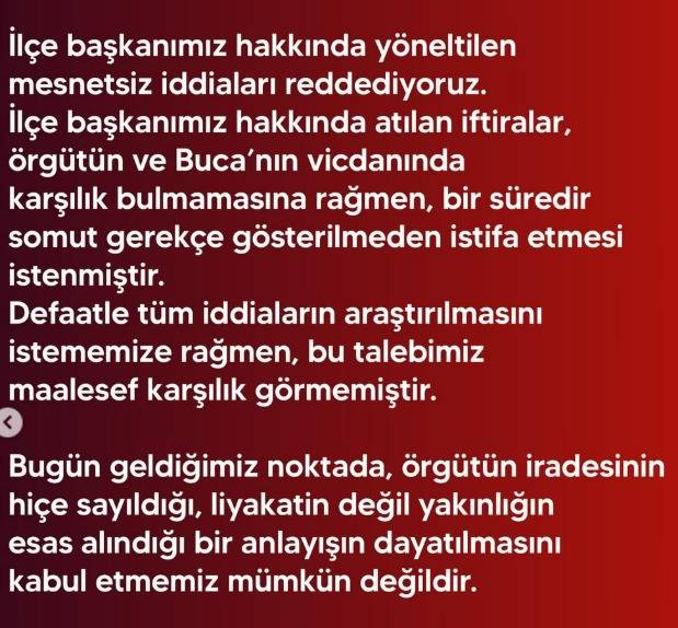 İlçe başkanımız hakkında yöneltilen mesnetsiz iddiaları reddediyoruz. İlçe başkanımız hakkında atılan iftiralar, örgütün ve Buca’nın vicdanında karşılık bulmamasına rağmen, bir süredir somut gerekçe gösterilmeden istifa etmesi istenmiştir. Defaatle tüm iddiaların araştırılmasını istememize rağmen, bu talebimiz maalesef karşılık görmemiştir.
