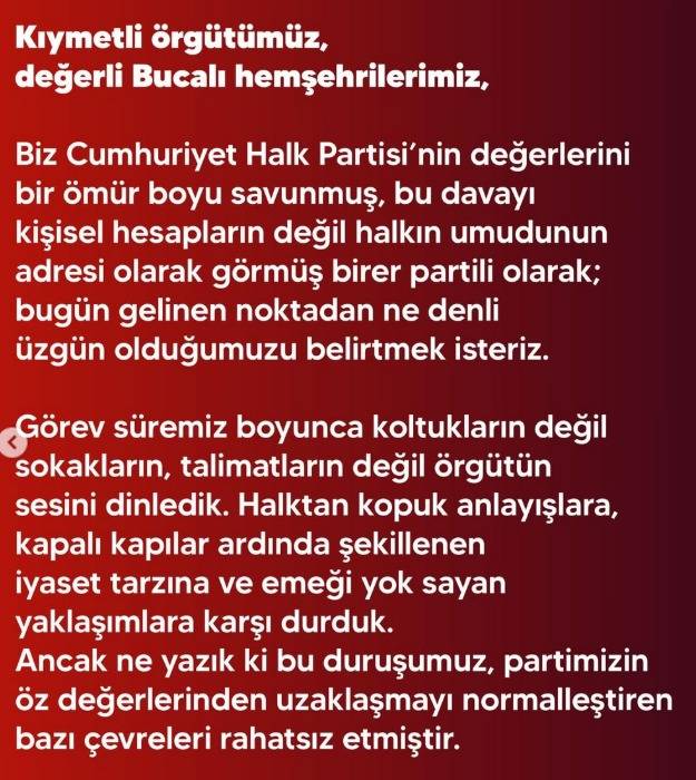 “Kıymetli örgütümüz, değerli Bucalı hemşehrilerimiz,Biz Cumhuriyet Halk Partisi’nin değerlerini bir ömür boyu savunmuş, bu davayı kişisel hesapların değil halkın umudunun adresi olarak görmüş birer partili olarak; bugün gelinen noktadan ne denli üzgün olduğumuzu belirtmek isteriz.