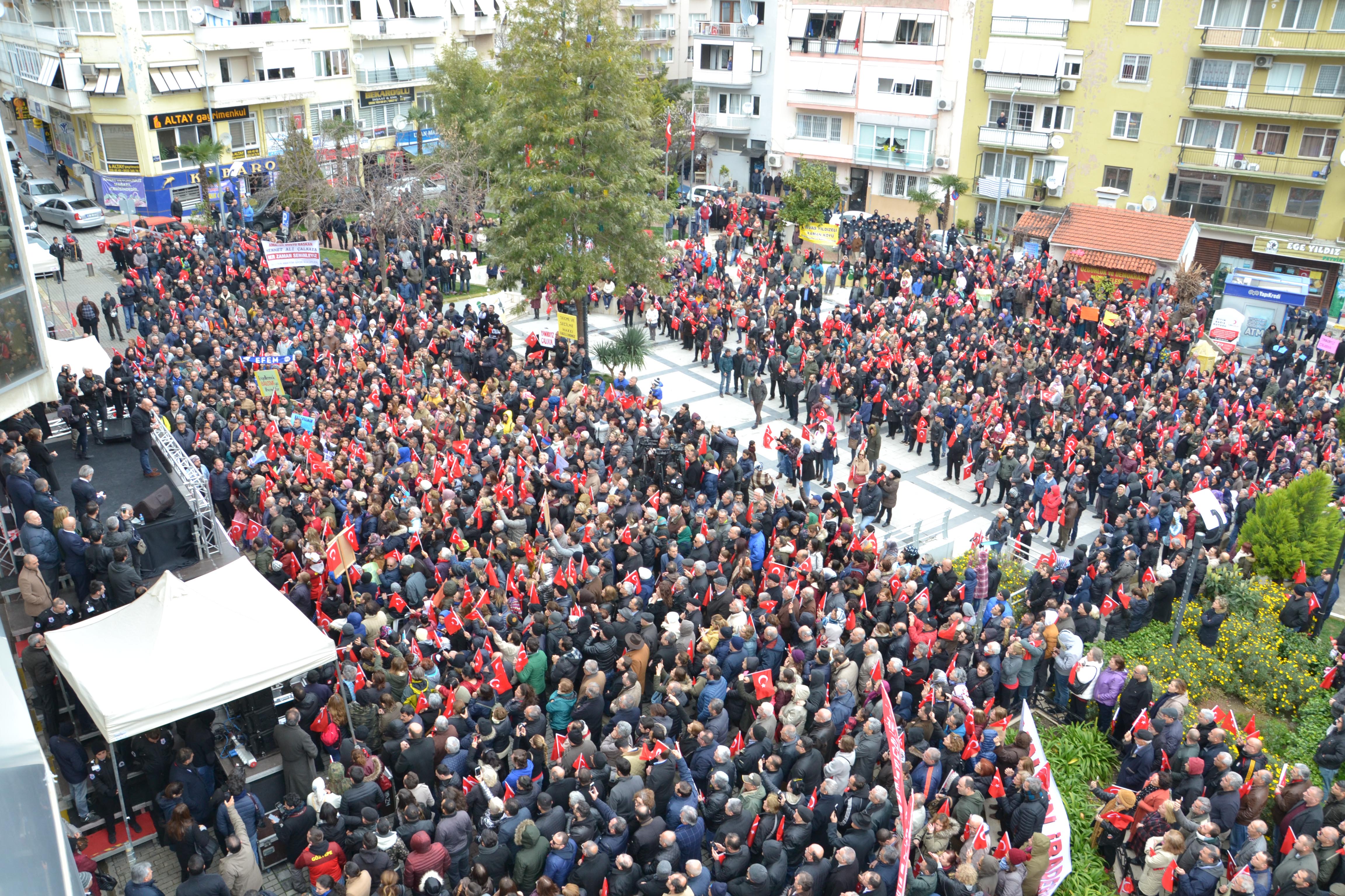 Cumhuriyet Meydanı’ndaki Kalabalığa hitaben yaptığı konuşmada yaşanan hukuki süreç ile ilgili bilgi veren Mehmet Ali Çalkaya “Onlarca özel müfettiş geldi gitti. Didik didik ettiler, hiçbir zaman halkın tek kuruşunu ne yedik ne de yedirdik. Bu kentin parasını kendi paramız kadar iktisatlı, doğru kullanarak harcadık. Bir insanı nasıl götürürsünüz; ‘hırsız’ diyemezsiniz, ‘çaldı’ diyemezsiniz, ‘yüz kızartıcı’ diyemezsiniz, siyasi oyunlarla göndermeye çalışırız.10 Ekim 2015 yılında Ankara Gar’ında bir katliam yaşandı. 12 Ekim’de KESK tarafından Gündoğdu Meydanı’nda bu katliamı protesto etmek için bir miting düzenlendi. O zaman ki İl Başkanımız, milletvekillerimiz diğer belediye başkanı arkadaşlarımla birlikte ben de o mitinge katıldım. Alandaki 10 binlerce kişi gibi slogan attım. Bu sloganlar nedeniyle bana Cumhurbaşkanı’na hakaretten dolayı dava açıldı. Cumhurbaşkanı 15 Temmuz hain darbe girişimden sonra açtığım tüm davaları geri çektim demesine rağmen sadece benim davam ettirildi. 11 ay 20 gün verilen ceza para cezasına çevrildi ben de cezamı ödeyerek suç olan şeyin karşılığını ödedim” dedi.