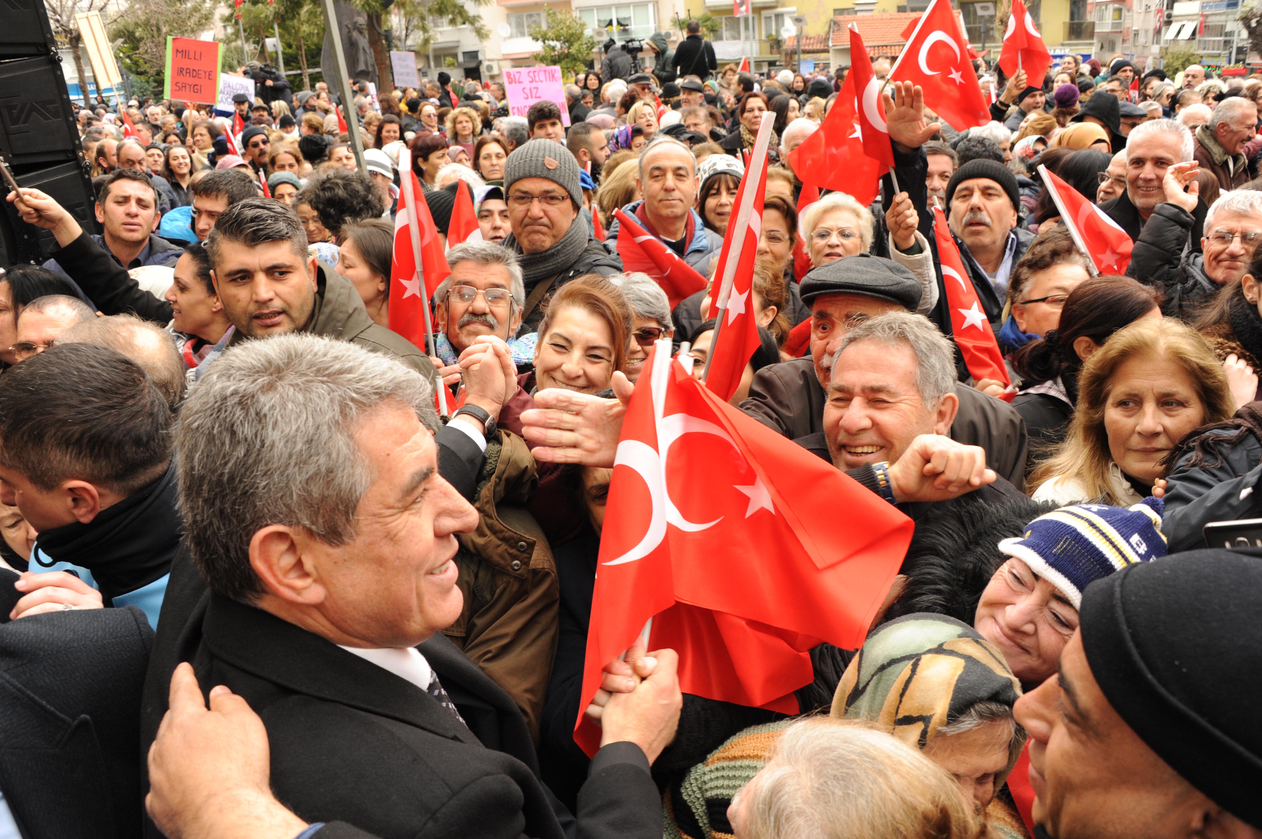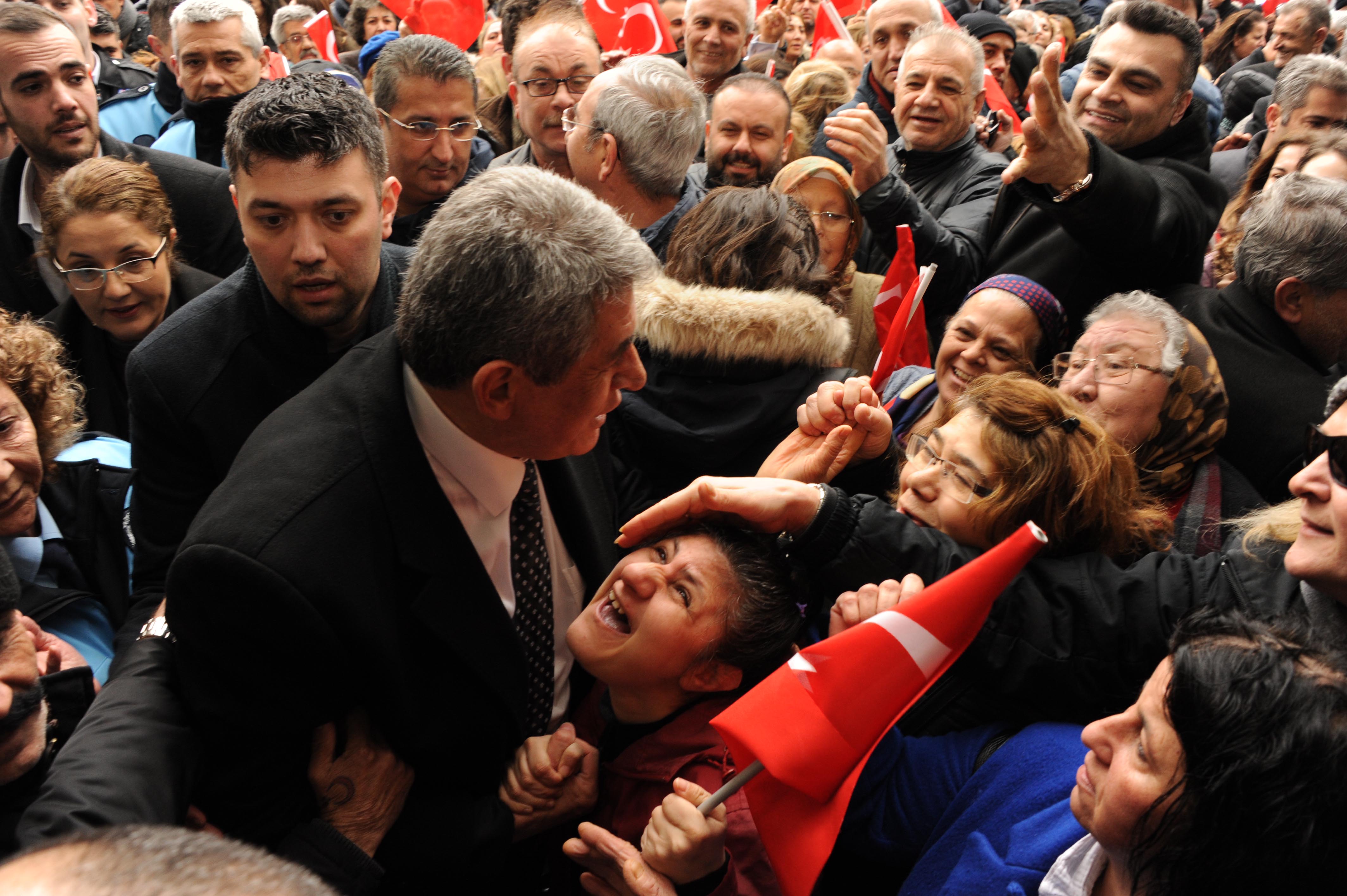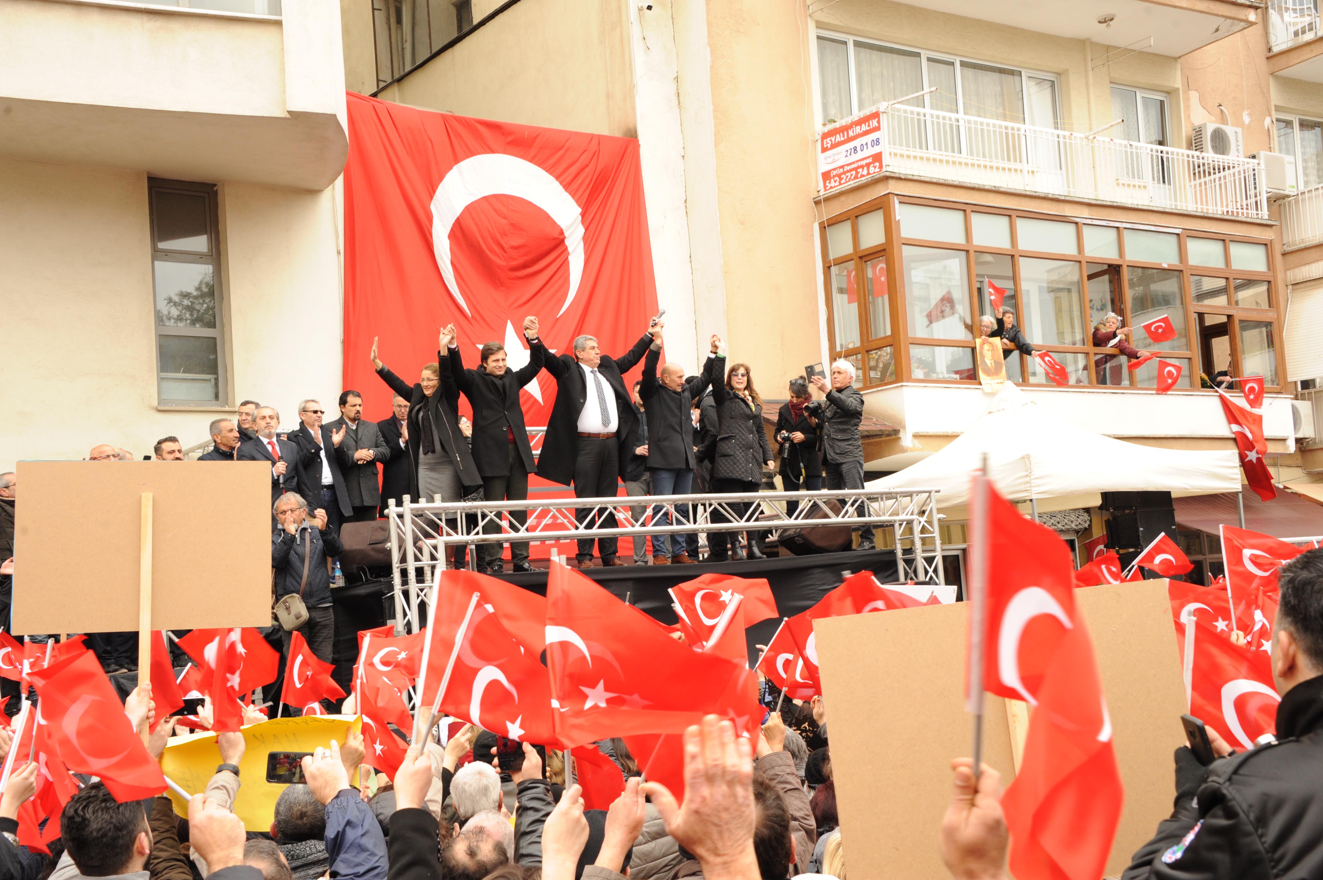 CHP İzmir İl Başkanı Deniz Yücel, üzgünüz, mutsuzuz ve içlerinin buruk olduğunu söyleyerek konuşmasına başladı. Baloça’yı Balçova yapan Mehmet Ali Çalkaya’nın adaylığının engellendiğini ileri süren Yücel, “ İsmi Balçova ile özdeşleşmiş Mehmet Ali Çalkaya’nın AKP’nin YSK’sı tarafından adaylığı engelleniyor. Neymiş Cumhurbaşkanı’na hakaret etmiş. Bu olay nedir anlatayım; CHP İzmir İl Başkanlığının katıldığı bir eylem, sendikaların katıldığı bir eylemde, slogan atılmış Cumhurbaşkanı’na hakaret teşkil eden. Belediye başkanımız boylu poslu, endamlı, yürüyüşün en önünde, pankart taşımış. Bu yüzden Mehmet Ali Çalkaya’ya 11 ay 20 gün ceza verilmiş. Seçilme hakkını kaybetmesi için aldığı cezanın 1 yılın üzerinde olması gerekiyor. Anayasanın 76. maddesine göre seçilme hakkına sahiptir belediye başkanımız. Burada bir oyun oynanıyor. AKP’nin YSK’sı, 15 senedir kente hizmet eden başkanımızın adaylığını kanunlara aykırı şekilde engelliyor. Hem bunu yapıyorlar, hem de demokrasiden, hukuk devletinden bahsediyorlar. İnsan haklarından bahsediyorlar. Çalkaya’yı AKP düzenine yedirecek miyiz? Hukuki süreç devam ediyor. Demokrasiye darbe vurulmaya çalışılıyor. Halkın iradesine darbe vurulmaya çalışılıyor. ‘Mutsuzuz, üzgünüz, içimiz buruk’ dedim ancak Mustafa Kemal Atatürk’ün bir sözü var; ‘umutsuz durum yok umutsuz insan vardır.’ Biz umudumuzu yitirmeyeceğiz. Başkanımızı kimseye yedirmeyeceğiz” dedi.