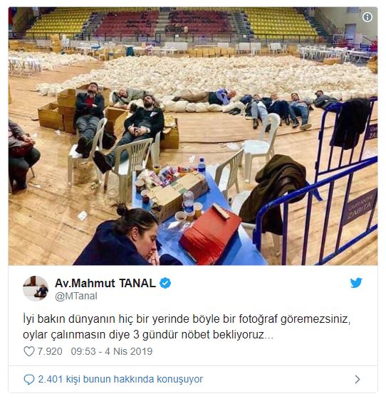 "İyi bakın. Dünyanın hiçbir yerinde böyle bir fotoğraf göremezsiniz. Oylar çalınmasın diye 3 gündür nöbet bekliyoruz" diyen Tanal, oyların bekletildiği spor salonundan bir fotoğraf paylaştı.