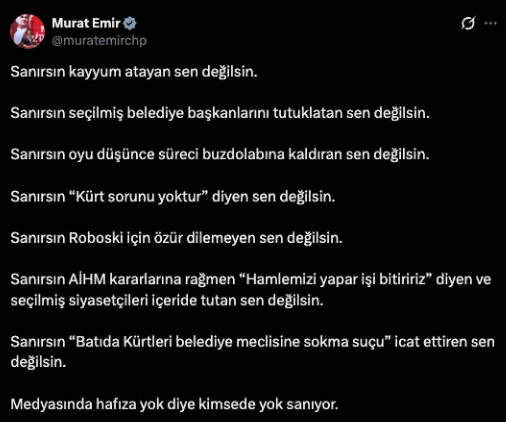 Erdoğan’ın bu açıklamalarının ardından CHP Grup Başkanvekili Murat Emir, sosyal medya platformu X üzerinden bir paylaşım yaparak karşılık verdi.