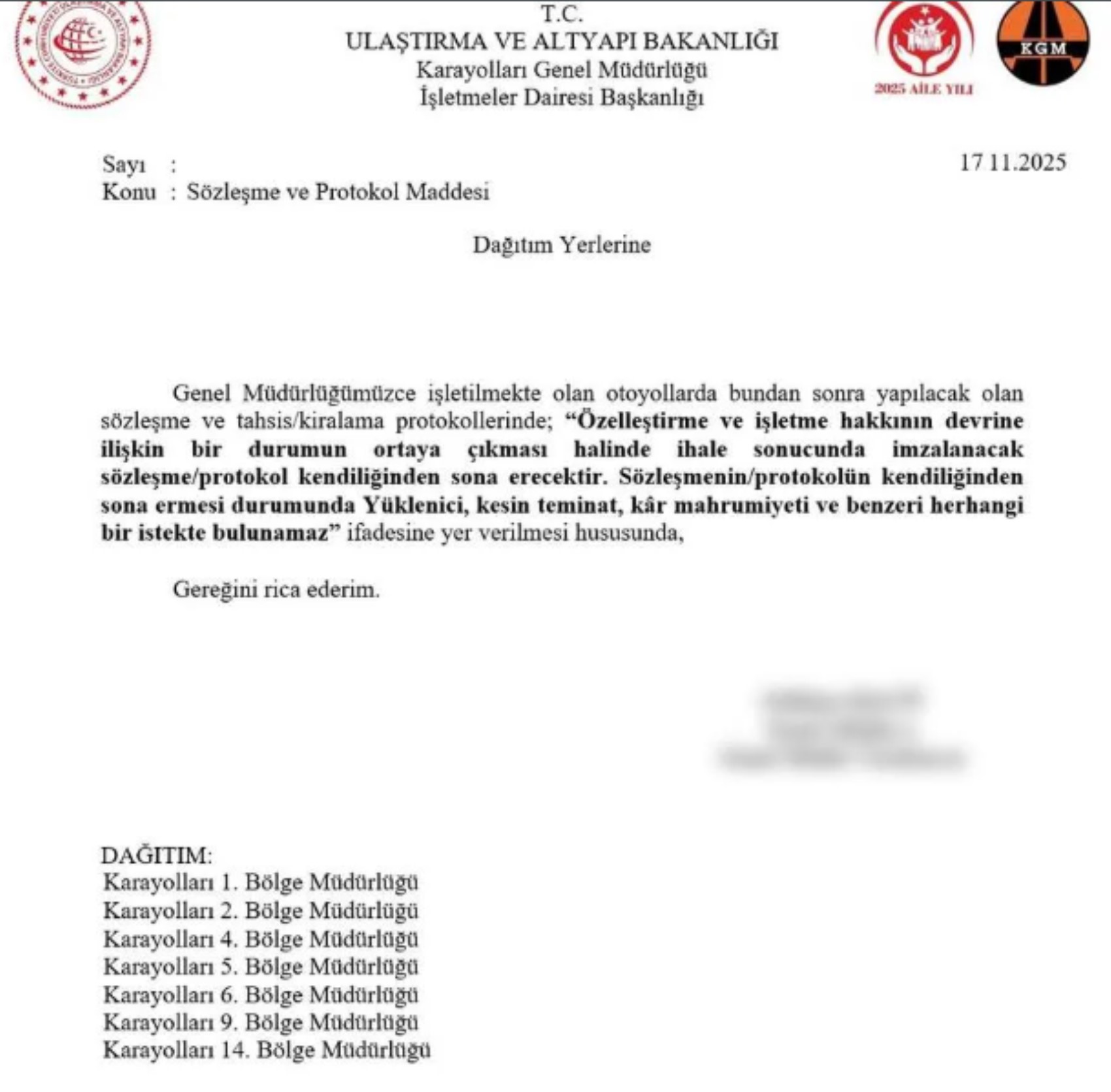 "Genel Müdürlüğümüzce işletilmekte olan otoyollarda bundan sonra yapılacak olan sözleşme ve tahsis/kiralama protokollerinde; "Özelleştirme ve işletme hakkının devrine ilişkin bir durumun ortaya çıkması halinde ihale sonucunda imzalanacak sözleşme/protokol kendiliğinden sona erecektir. Sözleşmenin/protokolün kendiliğinden sona ermesi durumunda Yüklenici, kesin teminat, kâr mahrumiyeti ve benzeri herhangi bir istekte bulunamaz" ifadesine yer verilmesi hususunda gereğini rica ederim"