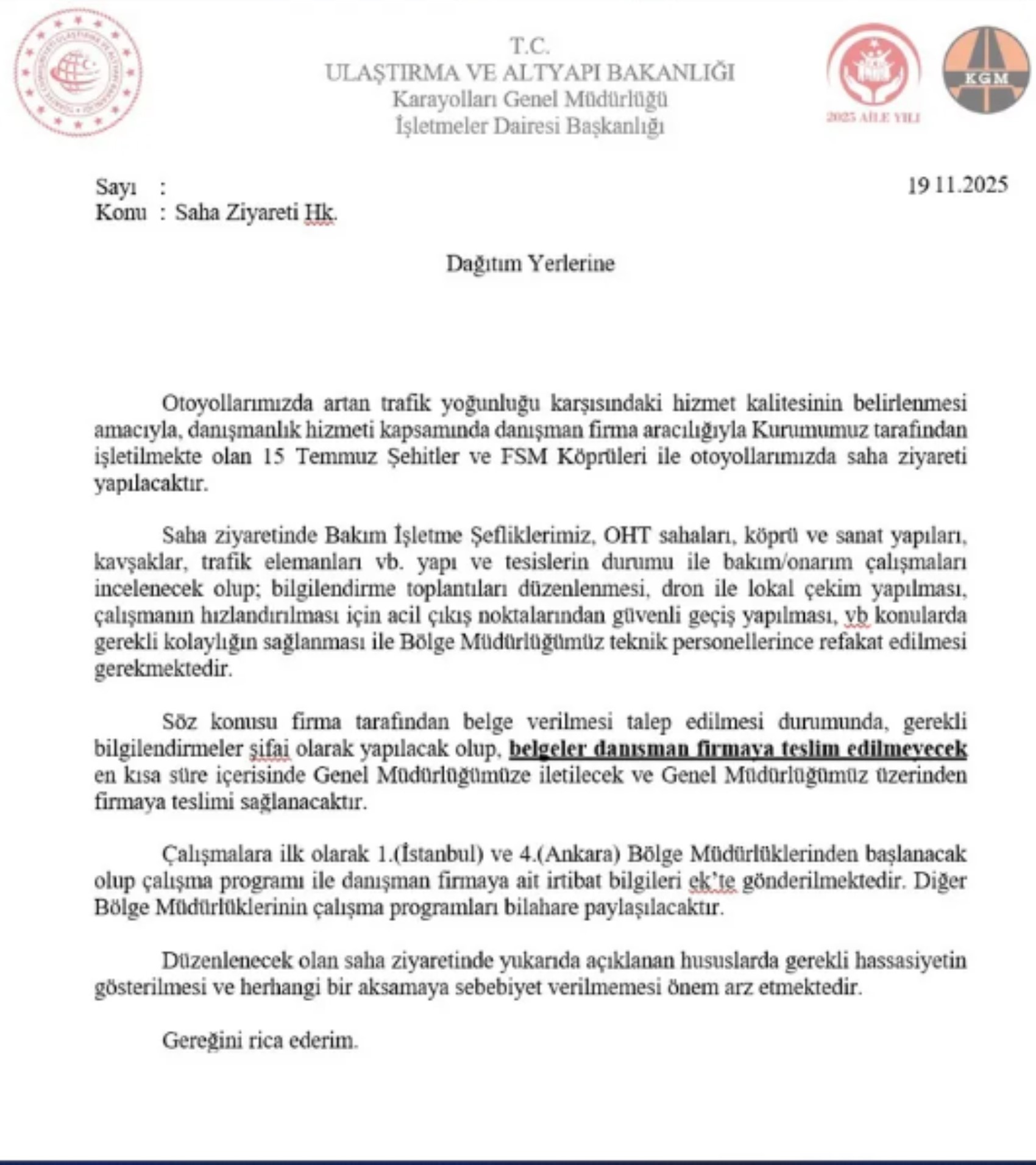 "Otoyollarımızda artan trafik yoğunluğu karşısındaki hizmet kalitesinin belirlenmesi amacıyla, danışmanlık hizmeti kapsamında danışman firma aracılığıyla Kurumumuz tarafından işletilmekte olan 15 Temmuz Şehitler ve FSM Köprüleri ile otoyollarımızda saha ziyareti yapılacaktır. Saha ziyaretinde Bakım İşletme Şefliklerimiz, OHT sahaları, köprü ve sanat yapıları, kavşaklar, trafik elemanları vb. yapı ve tesislerin durumu ile bakım/onarım çalışmaları incelenecek olup; bilgilendirme toplantıları düzenlenmesi, dron ile lokal çekim yapılması, çalışmanın hızlandırılması için acil çıkış noktalarından güvenli geçiş yapılması, vb konularda gerekli kolaylığın sağlanması ile Bölge Müdürlüğümüz teknik personellerince refakat edilmesi gerekmektedir. Söz konusu firma tarafından belge verilmesi talep edilmesi durumunda, gerekli bilgilendirmeler şifai olarak yapılacak olup, belgeler danisman firmaya teslim edilmeyecek en kısa süre içerisinde Genel Müdürlüğümüze iletilecek ve Genel Müdürlüğümüz üzerinden firmaya teslimi sağlanacaktır. Çalışmalara ilk olarak 1.(İstanbul) ve 4.(Ankara) Bölge Müdürlüklerinden başlanacak olup çalışma programı ile danışman firmaya ait irtibat bilgileri ek'te gönderilmektedir. Diğer Bölge Müdürlüklerinin çalışma programları bilahare paylaşılacaktır. Düzenlenecek olan saha ziyaretinde yukarıda açıklanan hususlarda gerekli hassasiyetin gösterilmesi ve herhangi bir aksamaya sebebiyet verilmemesi önem arz etmektedir. Gereğini rica ederim."