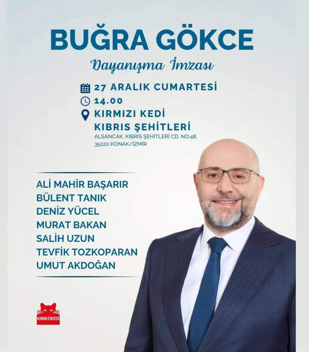 Öte yandan Akdoğan, 27 Aralık Cumartesi günü saat 14.00’te, Alsancak Kıbrıs Şehitleri Caddesi’nde yer alan Kırmızı Kedi Kitabevi’nde düzenlenecek dayanışma etkinliğine katılarak Buğra Gökçe’ye destekte bulunacak. Etkinlikte, İstanbul Davası kapsamında tutuklu bulunan Buğra Gökce’nin Silivri Cezaevi’nde kaleme aldığı “22 Metrekare Gökyüzü” adlı kitabı için imza etkinliği gerçekleştirilecek. Buğra Gökce, geçtiğimiz dönemlerde İzmir Büyükşehir Belediyesi Genel Sekreterliği de yapmıştı.
