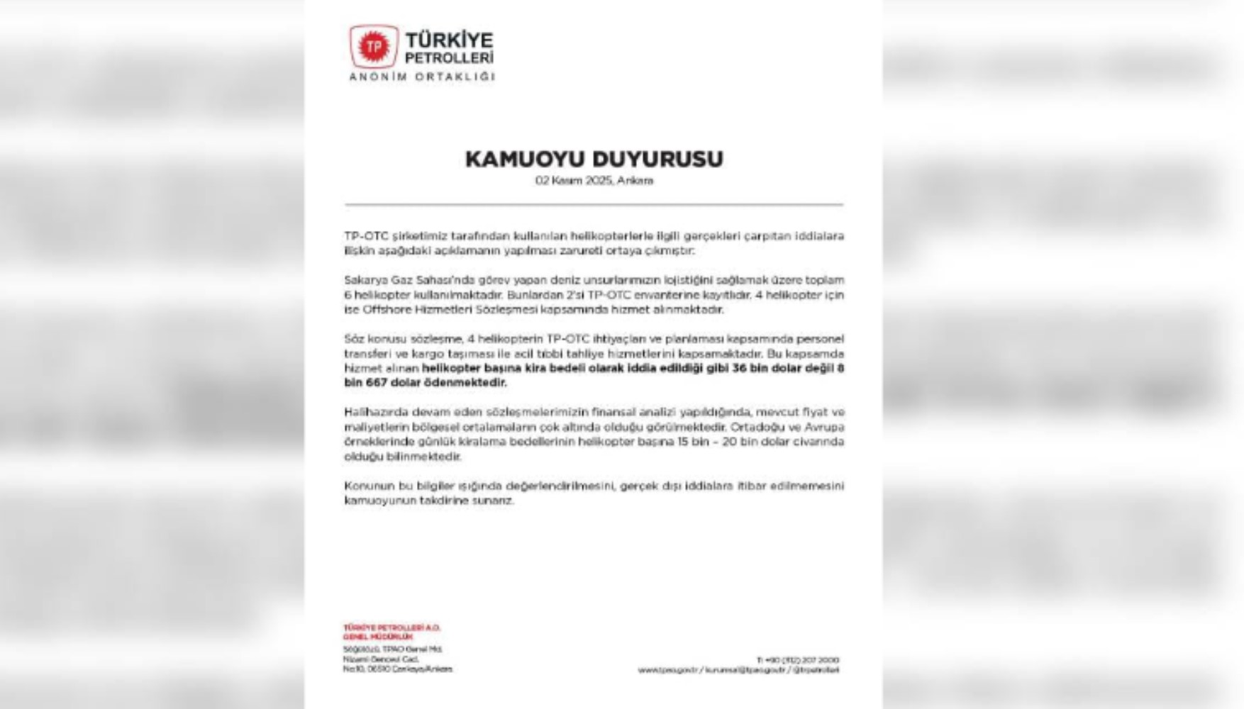 Deniz Yavuzyılmaz, Türkiye Petrolleri tarafından yapılan açıklamaya videolu bir yanıt verdi. Yavuzyılmaz, "Belgeye belgeyle yanıt vermek zorundalar" diyerek, elindeki belgeleri tekrar gündeme getirdi. Yavuzyılmaz, Türkiye Petrolleri'nin iddialarına karşılık olarak, Yavuz adlı sondaj gemisi için 2024 yılı ekim ayında yapılan helikopter kiralama ödemesinin 31 gün için günlük 36 bin dolar, aylık ise 1 milyon 116 bin dolar olduğunu belirtti.