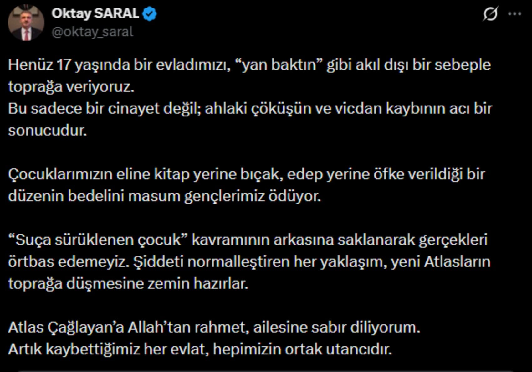 15 yaşındaki başka bir çocuk tarafından bıçaklanarak öldürülen Atlas'la ilgili olarak çok sayıda tepki paylaşımı gelirken, Cumhurbaşkanı Başdanışmanı Oktay Saral'dan da çarpıcı bir açıklama geldi.