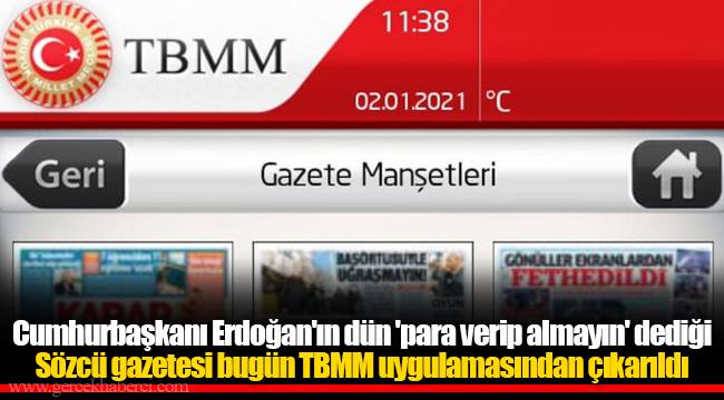 TBMM'nin yasama faaliyetleri, haberler ve tutanakların yer aldığı aplikasyonun gazete manşetleri yer alan bölümünde Sözcü gazetesinin yer almadığı görüldü. Aplikasyonu milletvekili, çalışan ve basın mensupları kullanıyor.