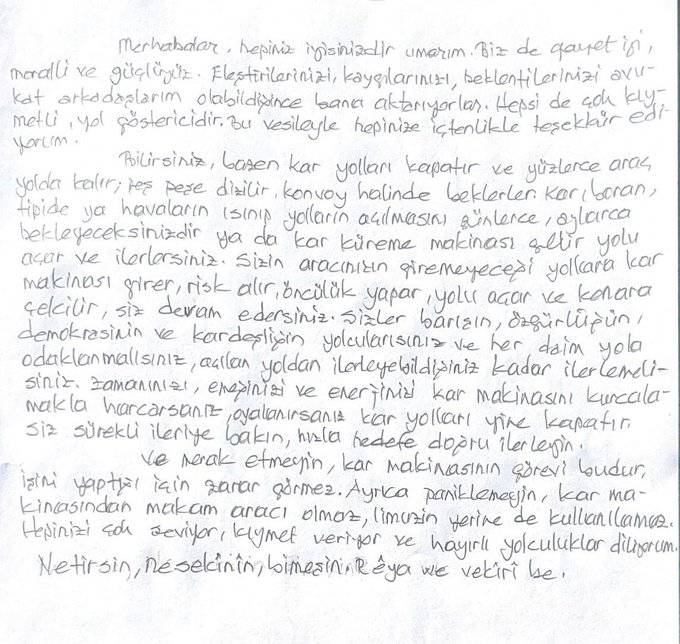Bilirsiniz, bazen kar yolları kapatır ve yüzlerce araç yolda kalır; peş peşe dizilir, konvoy halinde beklerler. Kar, boran, tipide ya havaların ısınıp yolların açılmasını günlerce, aylarca bekleyeceksinizdir ya da kar küreme makinası gelir, yolu açar ve ilerlersiniz. Sizin aracınızın giremeyeceği yollara kar makinası girer, risk alır, öncülük yapar, yolu açar ve kenara çekilir, siz devam edersiniz. Sizler barışın, özgürlüğün, demokrasinin ve kardeşliğin yolcularısınız ve her daim yola odaklanmalısınız; açılan yoldan ilerleyebildiğiniz kadar ilerlemelisiniz. Zamanınızı, emeğinizi ve enerjinizi kar makinasını kurcalamakla harcarsanız oyalanırsınız, kar yolları yine kapatır. Siz sürekli ileriye bakın, hızla hedefe doğru ilerleyin.