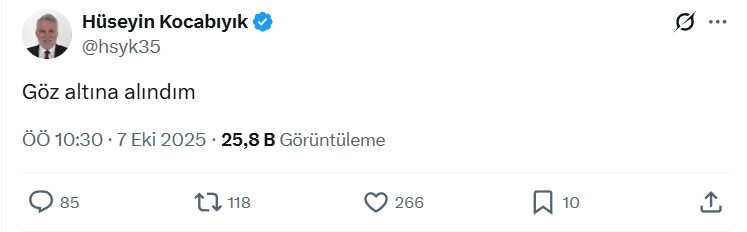 Gazeteci Saymaz da Kocabıyık'ın paylaşımının ardından sosyal medya hesabından yaptığı paylaşımda, "Eski AK Parti İzmir Milletvekili Hüseyin Kocabıyık hakkında cumhurbaşkanına hakaret iddiasıyla soruşturma başlatıldı. Kocabıyık hakkında gözaltı ve evinde arama kararı verildi. Polis ekipleri şu an Kocabıyık’ın evinde arama yapıyor" diye yazdı.