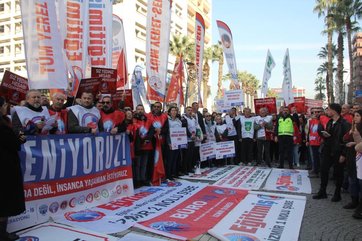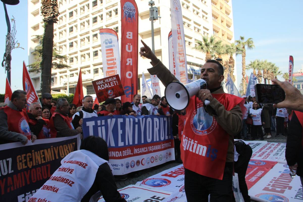 GÜLPERİ TİBİN/ GERÇEK HABERCİ - Günden güne zayıflayan ekonomi, toplumun çeşitli kesimlerinde tepkilere neden olmaya devam ediyor. Son olarak Birleşik Kamu Sen'e bağlı 200 bin Kamu çalışanı 19 Aralık Cuma günü (bugün) yurt geneline iş bırakma kararı aldı. Söz konusu eyleme ilişkin, Birleşik Kamu Sen İzmir İl Şubesi, Sosyal Güvenlik Kurumu (SGK) İzmir İl Müdürlüğü önünde basın açıklaması gerçekleştirdi. Açıklamayı topluluk adına Birleşik Kamu Sen İzmir İl Başkanı Barış Düdü okudu. AK Parti iktidarının ekonomi yönetimini hedef alan ve eleştiren Düdü, "Birleşik Kamu-İş Konfederasyonu’na bağlı sendikalar olarak; AKP iktidarının emekçiyi yoksullaştıran, sermayeyi koruyan ekonomi politikalarına karşı insanca yaşam, adil ücret ve hakça paylaşım talebiyle 19 Aralık’ta üretimden gelen gücümüzü kullanıyor, iş bırakıyoruz.