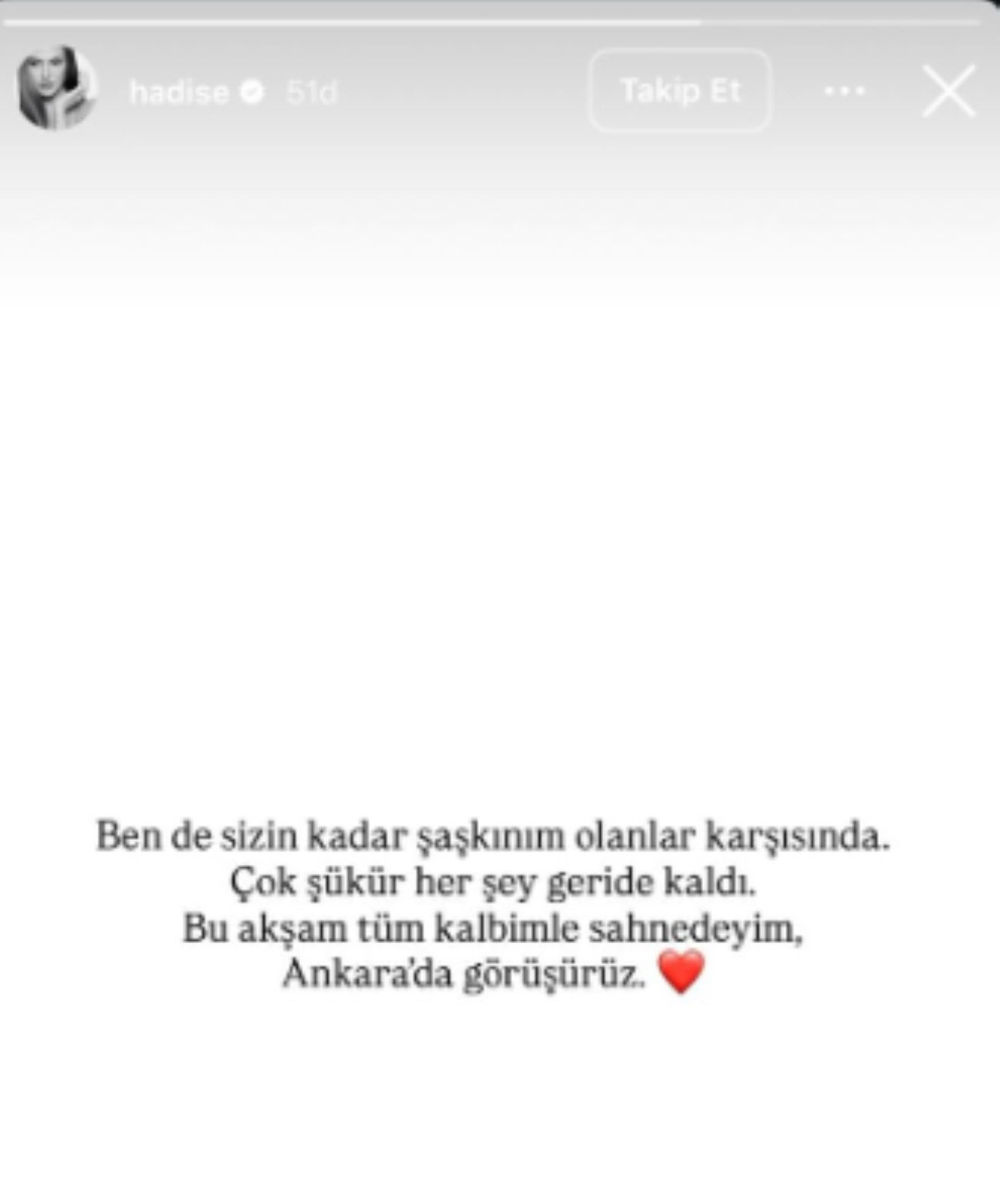 "Ben de sizin kadar şaşkınım olanlar karşısında. Çok şükür her şey geride kaldı. Bu akşam tüm kalbimle sahnedeyim, Ankara'da görüşürüz."