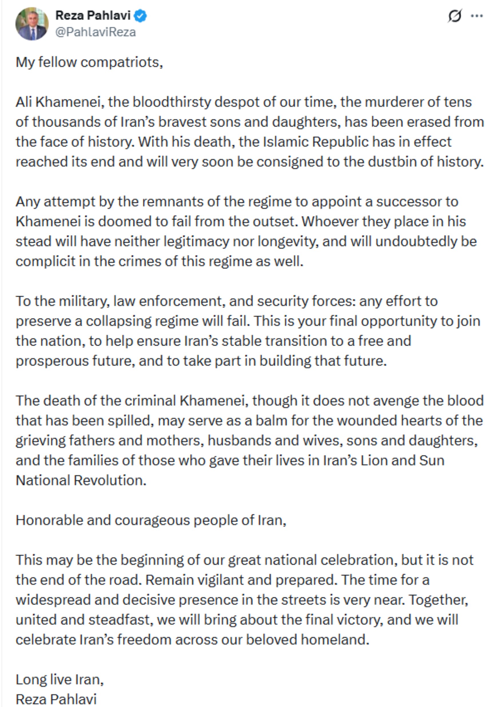 İran halkına da seslenen Pehlevi, "Bu, büyük ulusal kutlamamızın başlangıcı olabilir; fakat yolun sonu değildir. Dikkatli ve hazırlıklı olun. Sokaklarda geniş ve kararlı bir varlık gösterme zamanı çok yakında. Birlik ve kararlılıkla nihai zafere ulaşacak, sevgili vatanımızın dört bir yanında İran’ın özgürlüğünü kutlayacağız" ifadelerini kullandı.