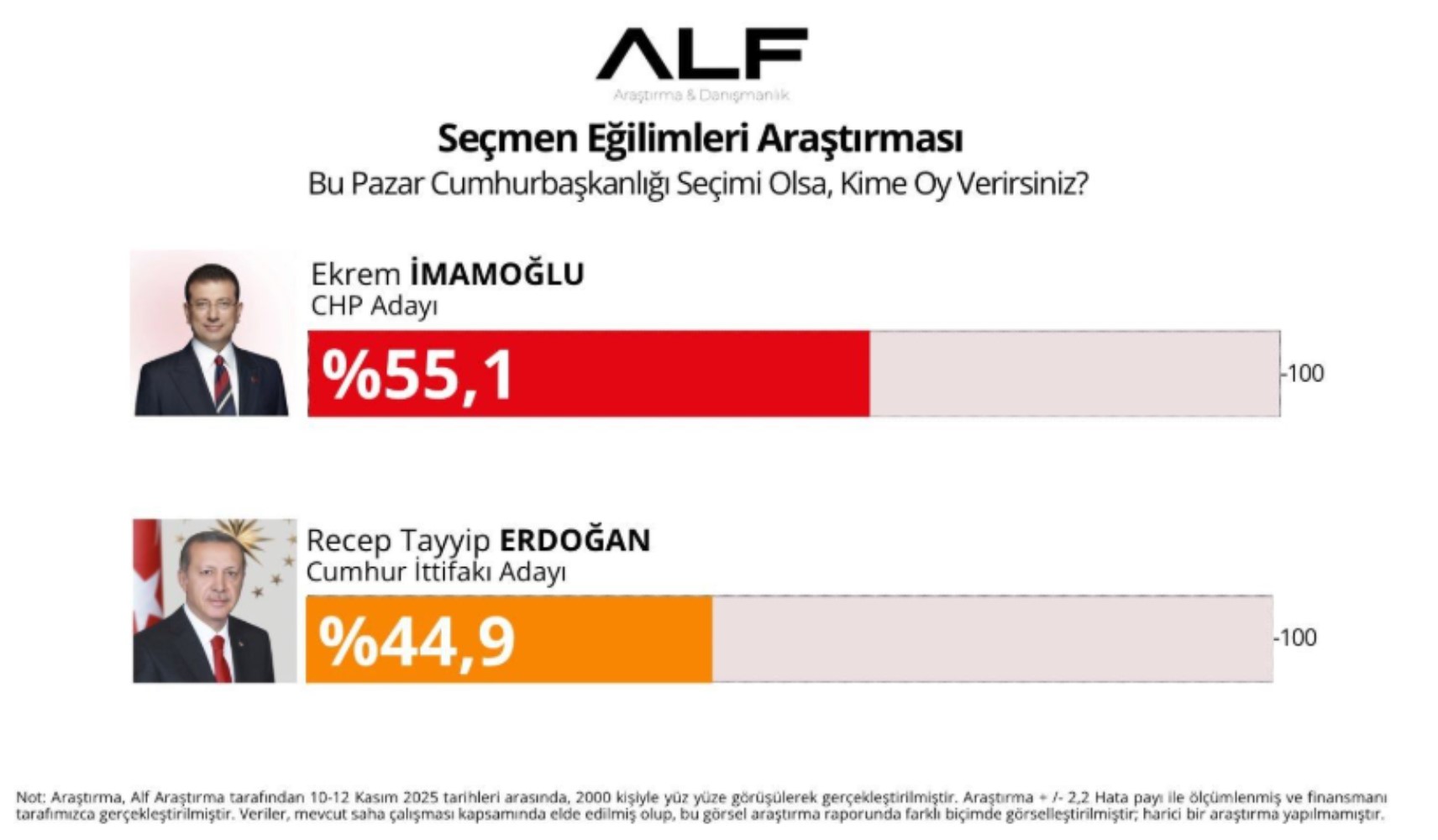 İddianamenin 11 Kasım’da yazıldığı dönemde ALF Araştırma tarafından iki adaylı cumhurbaşkanlığı seçimi senaryosuna yönelik bir anket gerçekleştirildi.