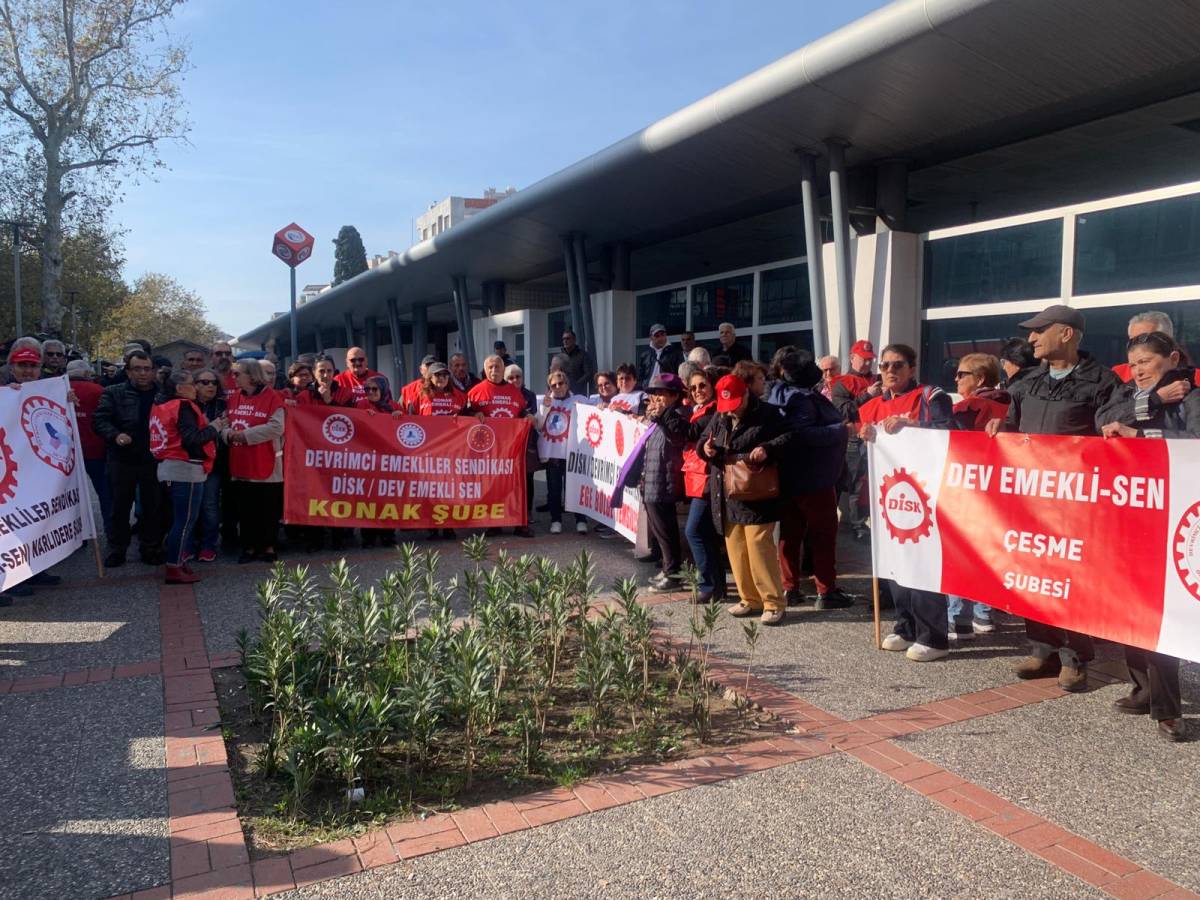 Kaynak’ın ardından basın açıklamasını okuyan DEV EMEKLİ SEN Karşıyaka Şube Başkanı Seçkin Dönmez, şunları kaydetti: “Aralık ayı, milyonlarca emekçi ve emekli için bir sonraki yılın, insan onuruna yakışır bir yaşam mı, yoksa hayatta kalma mücadelesi mi olacağının belirleneceği kritik bir kavşaktır. Bugün 10 Aralık İnsan Hakları Günü, insan hakları evrensel beyannamesinin kabul edildiği gün olan 10 Aralık 1948’den bu yana her 10 Aralık’ta kutlanan gündür. İnsan Hakları; tüm insanların hiçbir ayrım gözetmeksizin yalnızca insan oluşlarından dolayı eşit, özgür ve onurlu bir yaşama hakkına sahip olmasıdır. Herkes, cinsiyet, ırk, din, dil, yaş, tabiyet, düşünce farkı, ulusal veya toplumsal köken, zenginlik gibi fark olmaksızın kanunun karşısında eşittir. Der. Bu gün bizim ülkemizde emeklilerin ve emekçilerin 30 bin liraya yaklaşan açlık sınırının altında kalarak yaşamaya mahkûm edilmeleri asla kabul edilemez. Türkiye’de emeklilerin; Maaş bandı; 17 bin lira bile olmayan maaşlarla şöyle bir baktığımızda: 17 bin–18 bin lira maaş alanlar 5 milyon 80 bin kişi ile toplam emeklilerin yüzde 38’ini 18 bin–18 bin lira maaş alanlar 5 milyon 120 bin kişi ile toplam emeklilerin yüzde 32’sini 18 bin–20 bin lira arası maaş alanlar 2 milyon 880 bin kişi ile yüzde 18’ini, 20 bin–25 bin arası maaş alanlar 1 milyon 280 bin kişi ile yüzde 8’ini 25 bin üstü maaş alanlar ise 640 bin kişi ile toplam emeklilerin yüzde 4’ünü oluşturmaktadır. Bu tablo bile ülkemiz emeklilerinin açlık ve yoksulluk içinde ölüme nasıl da mahkûm edildiğinin acı bilançosudur. Pazar yerlerinde pazar artıkları toplayarak bir tencere kaynatmaya çalışan, kasabın manavın önünden bile geçmeye mecali olmayan emeklilerimizin büyük çoğunluğu gıda yetersizliğinden çeşitli hastalıklarla boğuşmak zorunda kalırken, birçok hastanelerden randevu alamamaları, dışlanmışlık, duygularıyla emeklilerimizi perişan etmektedir.”