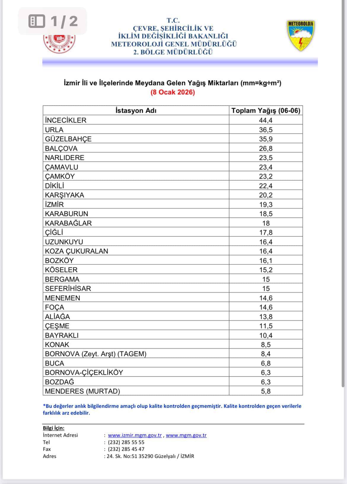 GÜLPERİ TİBİN/ GERÇEK HABERCİ - İzmir’de dün geceden beri etkisini gösteren ve sabah saatlerinden itibaren artış göstererek devam eden sağanak yağmur sonrasında hangi ilçeye ne kadar yağış düştüğü belli oldu. Açıklanan verilere göre, İzmir’de en çok yağış alan ilçe Bergama oldu. Bergama’ya metrekareye 44,4 kilogram yağış düştüğü kaydedildi. Öte yandan Urla’da 36,5 kilogram, Güzelbahçe’de 35,9 kilogram, Balçova’da 26,8 kilogram, Narlıdere’de 23,5 kilogram, Karşıyaka’da 20,2 kilogram, Karabağlar’da 18 kilogram, Çiğli’de 17,8 kilogram ve Menderes’te 5,8 kilogram yağış düştüğü görüldü.