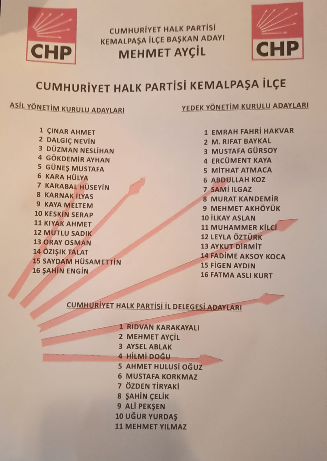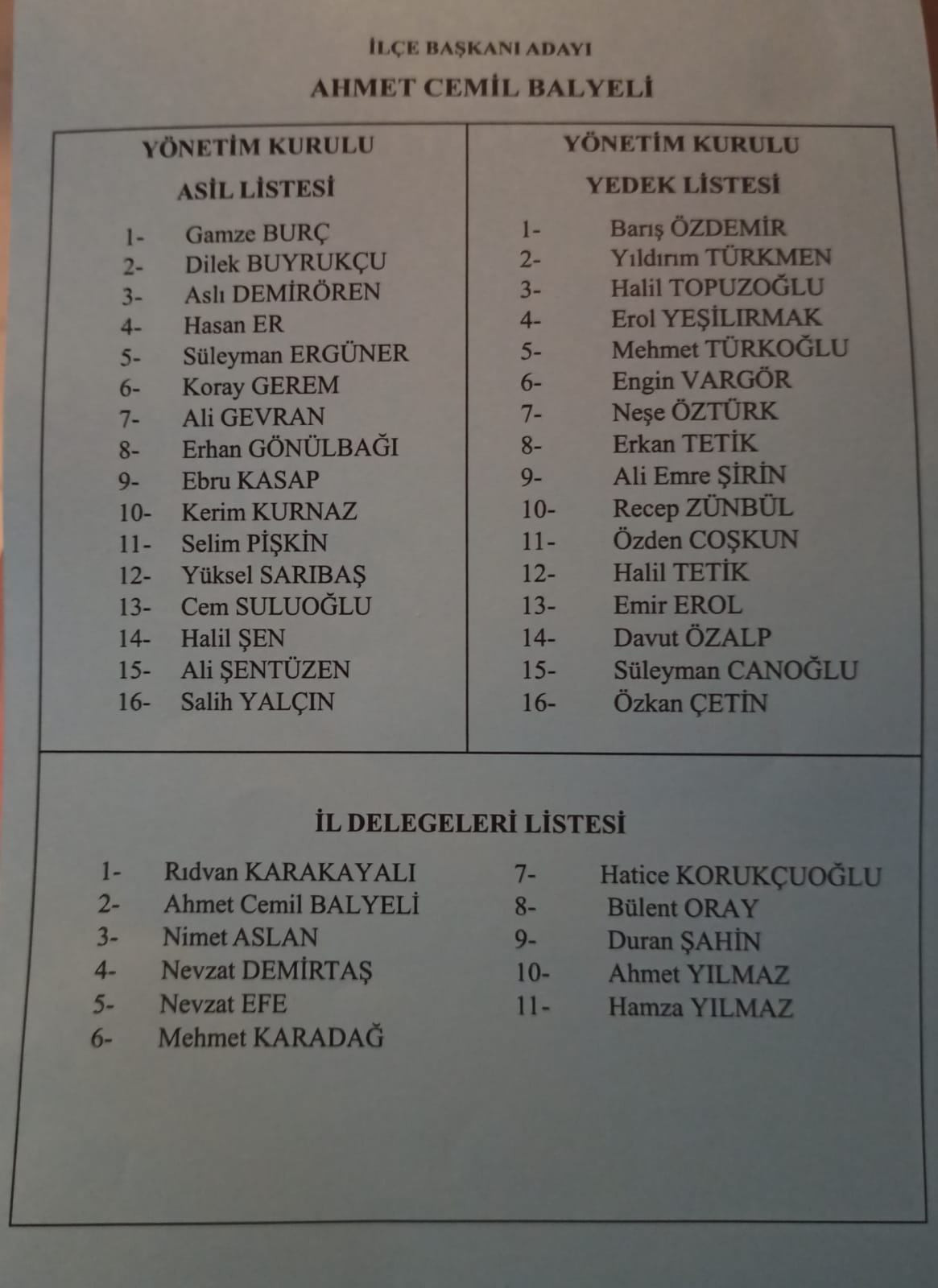 Mehmet Ayçil’in asil yönetim kurulu listesi: Ahmet Çınar, Nevin Dalgıç, Neslihan Düzman, Ayhan Gökdemir, Mustafa Güneş, Hülya Kara, Hüseyin Karabal, İlyas Karnak, Meltem Kaya, Serap Keskin, Ahmet Kıyak, Sadık Mutlu, Osman Oray, Talat Özışık, Hüsamettin Saydam, Engin Şahin.