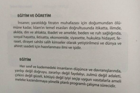 Eğitim için genel tanımlama 'okullar, kurslar ve üniversiteler vasıtasıyla bireylere hayatta gerekli olan bilgi ve kabiliyetlerin sistematik bir şekilde verilmesi' şeklinde olurken, dergi, eğitim ve öğretim kavramlarını İslam’ı referans alarak yeniden tanımladı.