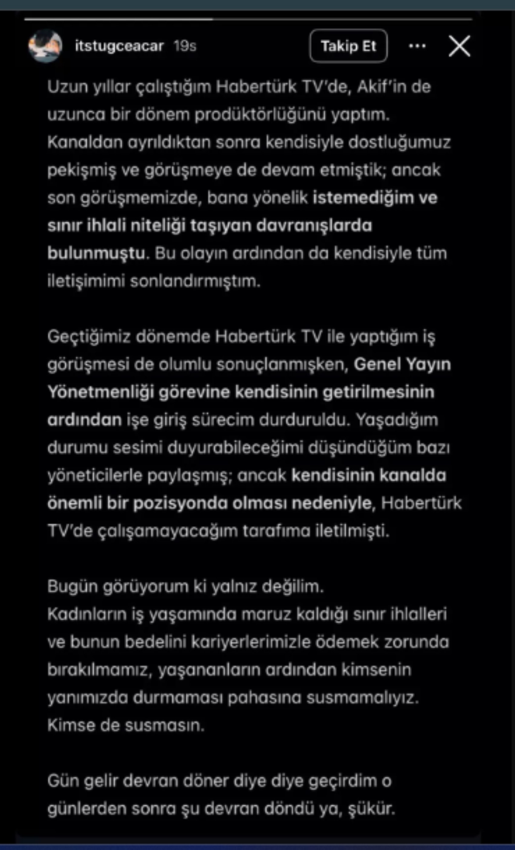 "Uzun yıllar çalıştığım Habertürk TV’de, Akif’in de uzunca bir dönem prodüktörlüğünü yaptım. Kanaldan ayrıldıktan sonra kendisiyle dostluğumuz pekişmiş ve görüşmeye de devam etmiştik; ancak son görüşmemizde, bana yönelik istemediğim ve sınır ihlali niteliği taşıyan davranışlarda bulunmuştu. Bu olayın ardından da kendisiyle tüm iletişimimi sonlandırmıştım.