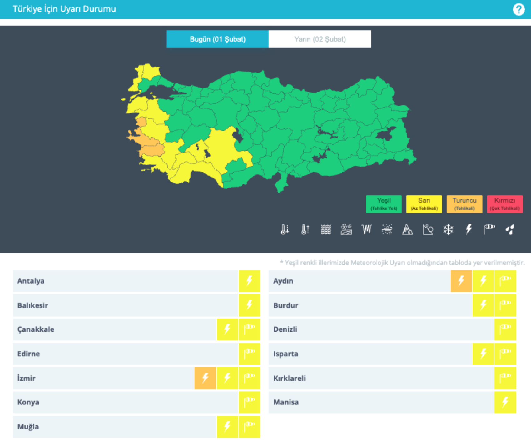 Meteoroloji Genel Müdürlüğü olarak yapılan değerlendirmelere göre: Ülkemiz genelinin parçalı ve çok bulutlu, yurt genelinin aralıklı yağışlı geçeceği tahmin ediliyor. Genellikle yağmur ve sağanak, Trakya kesimi, Batı Akdeniz’in Toroslar mevkii, Doğu Karadeniz’in iç kesimleri ile Doğu Anadolu'nun kuzey ve doğusunda karla karışık yağmur ve kar şeklinde görülecek olan yağışların; Kıyı Ege, İstanbul, Bursa, Çanakkale, Balıkesir, Manisa, Uşak, Denizli, Antalya, Isparta'nın güneyi, Burdur'un doğusunda kuvvetli olması bekleniyor. Rüzgarın; Güney ve İç Ege, Batı ve Orta Akdeniz, İç Anadolu ile Orta ve Doğu Karadeniz’in iç kesimlerinde güneyli yönlerden, Marmara’da kuzeyli yönlerden kuvvetli ve kısa süreli fırtına (40-70 km/saat) şeklinde esmesi bekleniyor. Sabah ve gece saatlerinde doğu bölgelerde buzlanma ve don olayı bekleniyor. Doğu Karadeniz’in iç kesimlerinin yüksekleri ile Doğu Anadolu’nun doğusunda yüksek kar örtüsüne sahip eğimli kesimlerinde çığ tehlikesi bulunmaktadır.