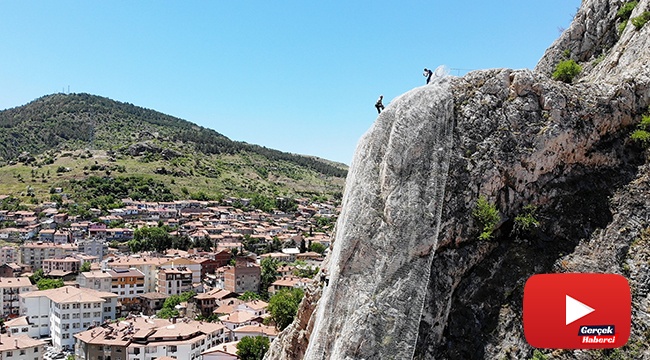 Tokat’ta metrelerce yüksekte ekmek parası için çalışan endüstriyel dağcılar yürekleri ağza getiriyor.