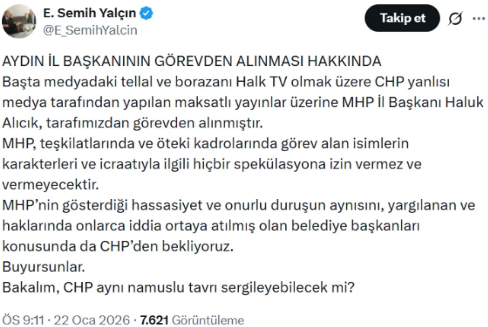 "MHP'nin gösterdiği hassasiyet ve onurlu duruşun aynısını, yargılanan ve haklarında onlarca iddia ortaya atılmış olan belediye başkanları konusunda da CHP'den bekliyoruz. Buyursunlar. Bakalım, CHP aynı namuslu tavrı sergileyebilecek mi?"