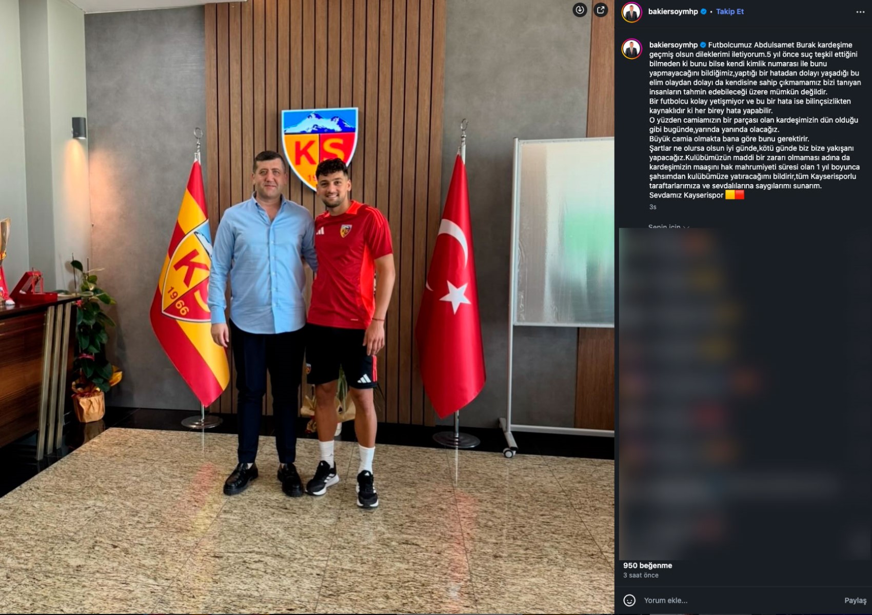 MHP Kayseri Milletvekili Baki Ersoy, sosyal medya hesabı Instagram üzerinden yaptığı açıklamayla, 12 ay futboldan uzaklaştırılan Abdulsamet Burak’a destek verdi.