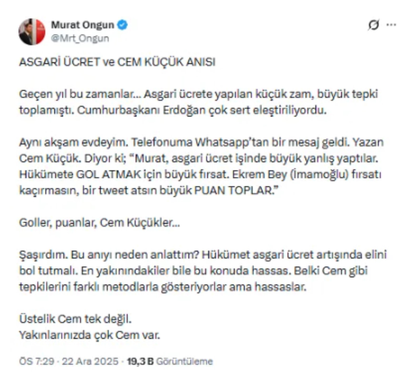 Ongun'un paylaşımına göre Cem Küçük, asgari ücretin açıklanması üzerine Ongun'a mesaj göndererek, "Murat, asgari ücret işinde büyük yanlış yaptılar. Hükümete gol atmak için büyük fırsat. Ekrem Bey (İmamoğlu) fırsatı kaçırmasın, bir tweet atsın büyük puan toplar" dedi.