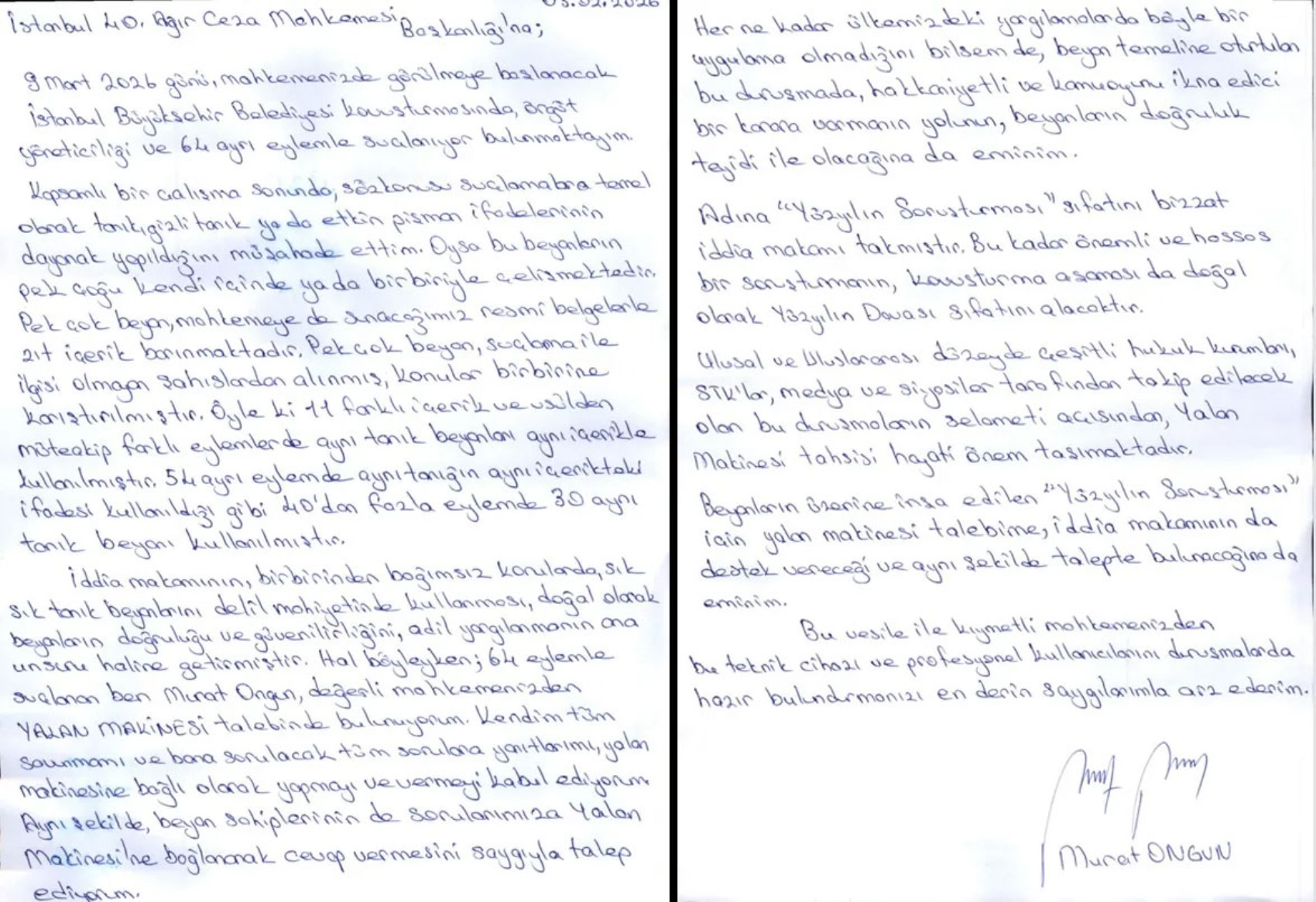 Savunmada, dosyanın iddia makamı tarafından dahi “yüzyılın soruşturması” olarak nitelendirildiği hatırlatıldı. Bu ölçekte ve kamuoyunda geniş yankı uyandıran bir davada şeffaflık ve denetlenebilirliğin önemine dikkat çekildi. Ongun, poligraf talebinin herhangi bir kişi ya da kurumu hedef almadığını, maddi gerçeğe ulaşma iradesinin ortaya konulmasına yönelik olduğunu ifade etti.