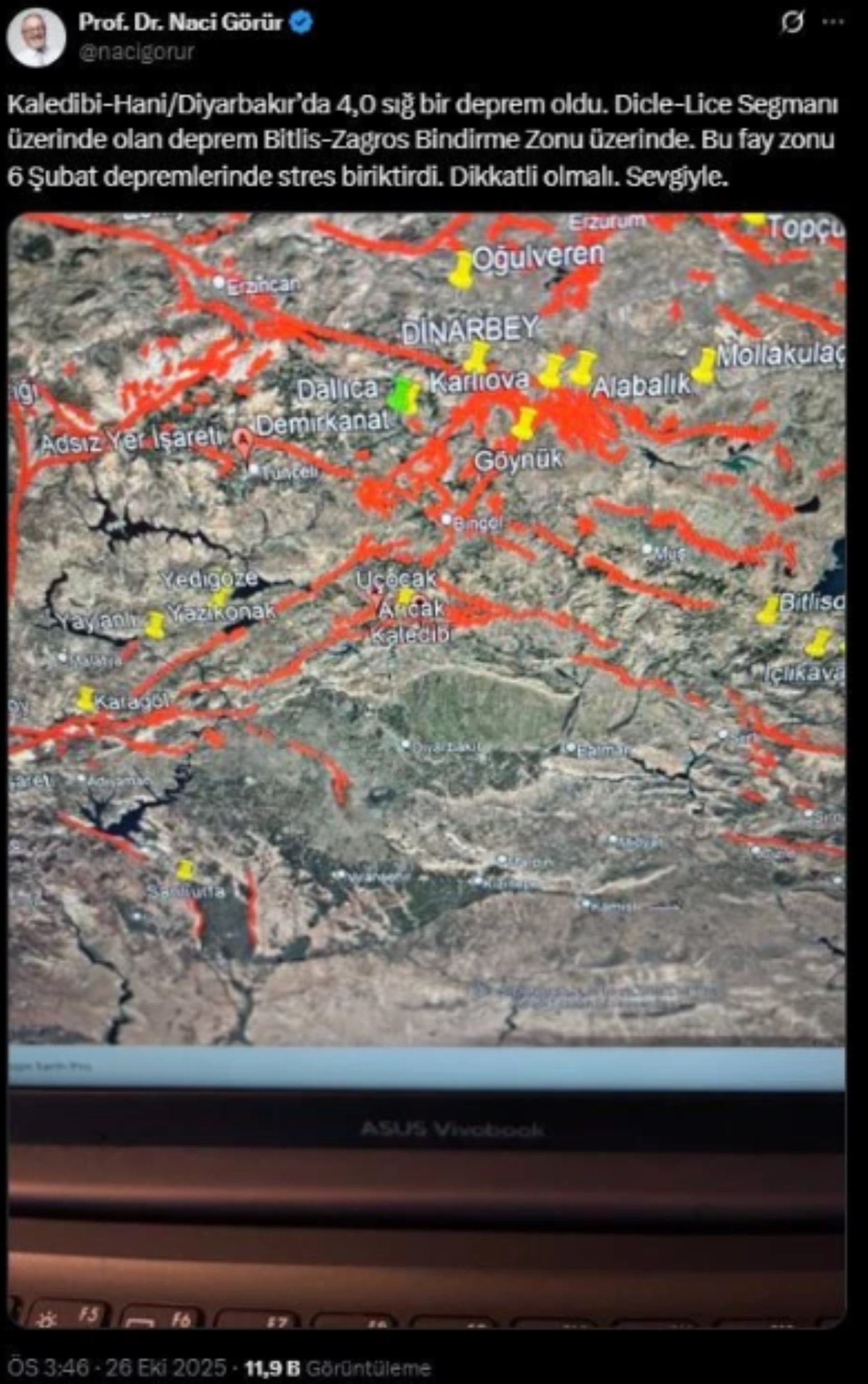Prof. Dr. Naci Görür, yaptığı paylaşımda 6 Şubat depremlerinin bu bölgede büyük stres birikimine neden olduğunu hatırlatarak, "Bu fay zonu üzerinde dikkatli olunmalı" uyarısında bulundu.