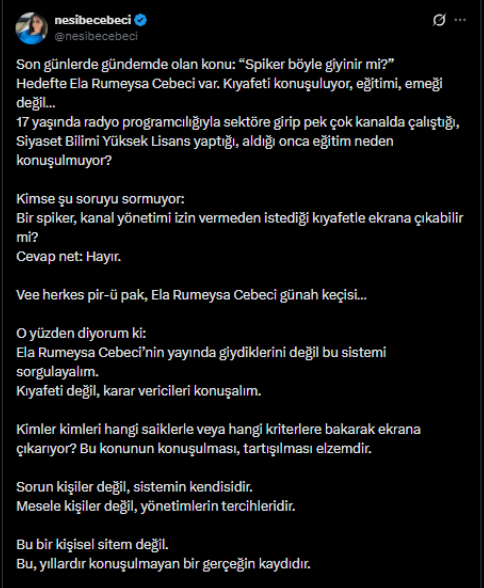 Ela Rumeysa Cebeci’nin yayında giydiklerini değil bu sistemi sorgulayalım.