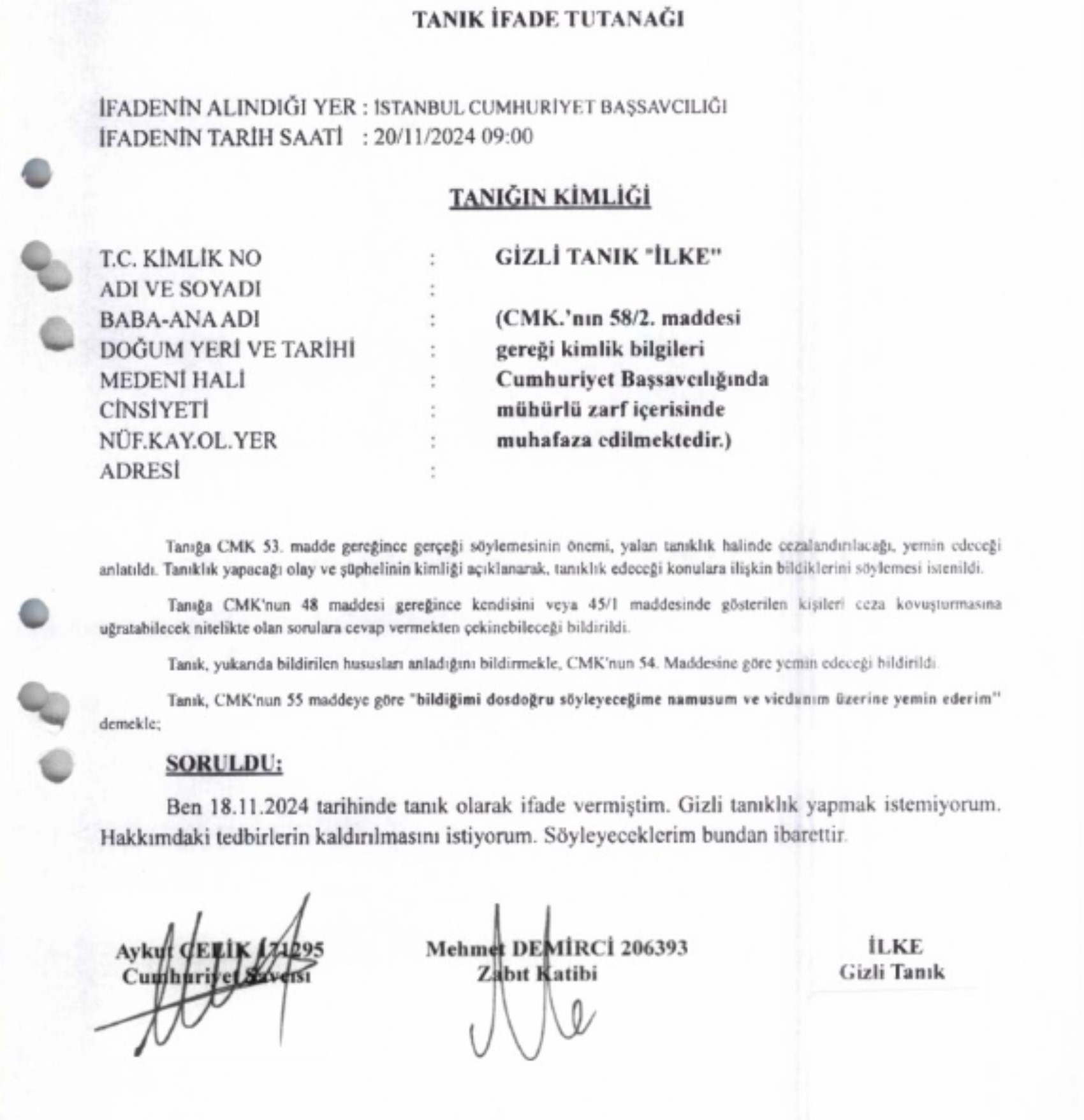 Özgür Özel, İBB iddianamesinde, başta 3 olan gizli tanık sayısının 15'e çıktığını ve 31 Mart'ta olmayan İlke isimli gizli tanıdığın 18 Kasım'da ifade verdiğini söyleyerek, "Meşe'nin yerine İlke'yi koyup Meşe'nin ifadelerini İlke'ye şarj etmişler!" demişti.