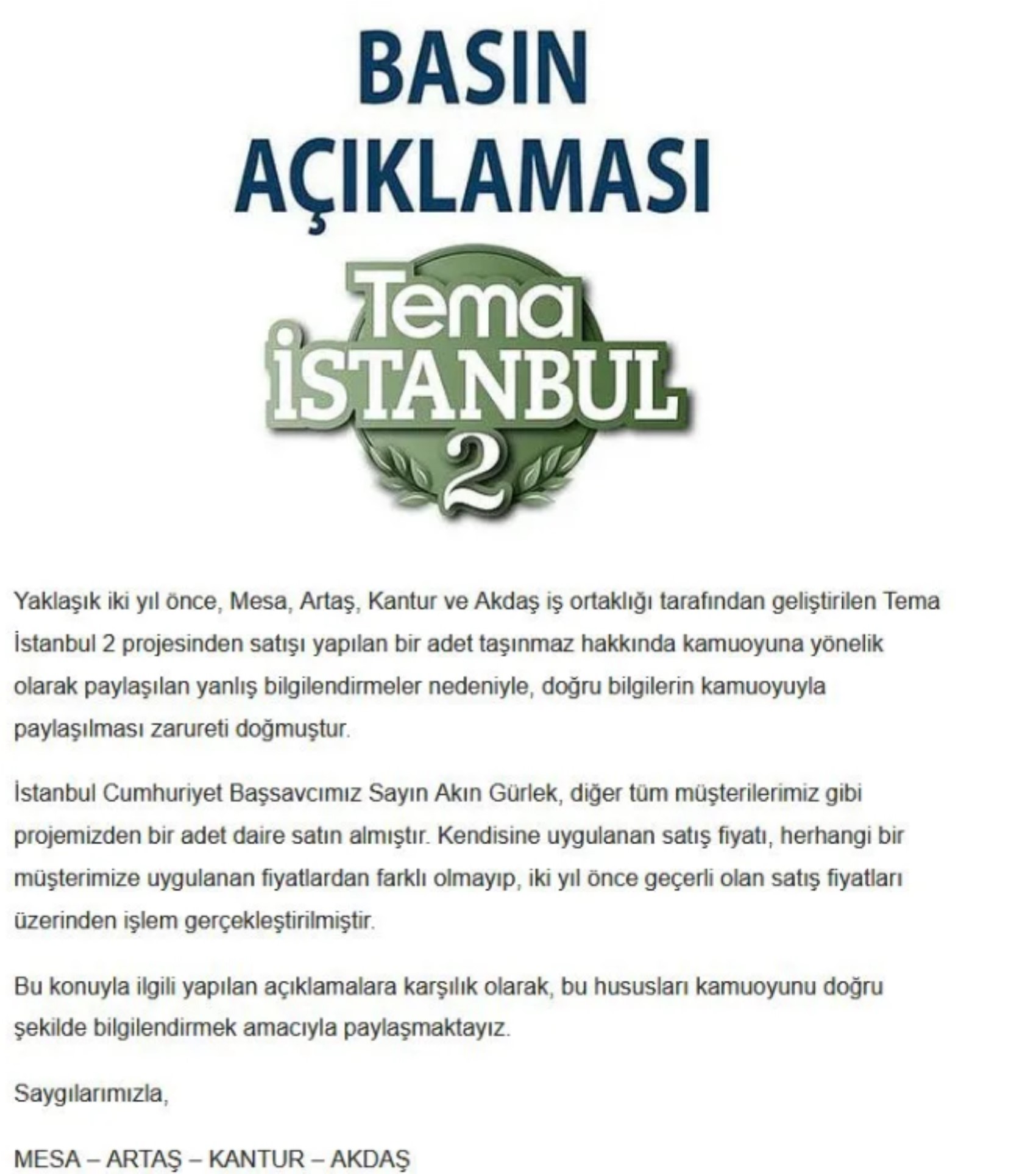 “İstanbul Cumhuriyet Başsavcısı Sayın Akın Gürlek, diğer tüm müşterilerimiz gibi projemizden bir adet daire satın almıştır. Kendisine uygulanan satış fiyatı, herhangi bir müşterimize uygulanan fiyatlardan farklı olmayıp, iki yıl önce geçerli olan satış fiyatları üzerinden işlem gerçekleştirilmiştir.”