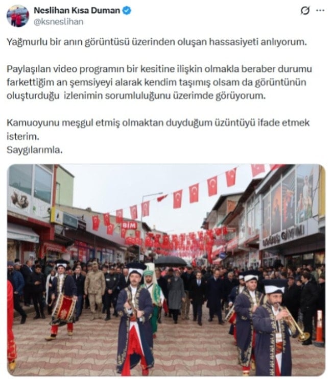 "Yağmurlu bir anın görüntüsü üzerinden oluşan hassasiyeti anlıyorum. Paylaşılan video programın bir kesitine ilişkin olmakla beraber durumu fark ettiğim an şemsiyeyi alarak kendim taşımış olsam da görüntünün oluşturduğu izlenimin sorumluluğunu üzerimde görüyorum. Kamuoyunu meşgul etmiş olmaktan duyduğum üzüntüyü ifade etmek isterim. Saygılarımla."